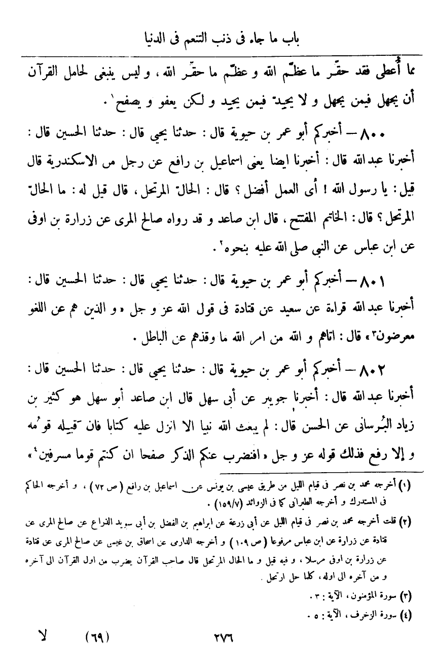 ٨٠٠ - أَخْبَرَكُمْ أَبُو عُمَرَ بْنُ حَيَوَيْهِ قَالَ: أَخْبَرَنَا يَحْيَى قَالَ: حَدَّثَنَا الْحُسَيْنُ قَالَ: أَخْبَرَنَا عَبْدُ اللَّهِ قَالَ: أَخْبَرَنَا أَيْضًا - يَعْنِي إِسْمَاعِيلَ بْنَ رَافِعٍ - عَنْ رَجُلٍ مِنَ الْإِسْكَنْدَرِيَّةِ، قَالَ: قِيلَ: يَا رَسُولَ اللَّهِ، أَيُّ الْعَمَلِ أَفْضَلُ؟ قَالَ: «الْحَالُّ الْمُرْتَحِلُ» قَالَ: قِيلَ لَهُ: مَا الْحَالُّ الْمُرْتَحِلُ؟ قَالَ: «الْخَاتِمُ الْمُفَتَتِحُ» ، قَالَ ابْنُ صَاعِدٍ: وَقَدْ رَوَاهُ صَالِحٌ الْمُرِّيُّ، عَنْ زُرَارَةَ بْنِ أَوْفَى، عَنِ ابْنِ عَبَّاسٍ، عَنِ النَّبِيِّ صَلَّى اللهُ عَلَيْهِ وَسَلَّمَ بِنَحْوِهِ