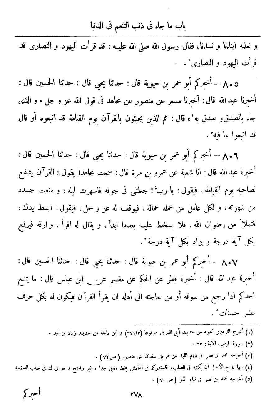 ٨٠٥ - أَخْبَرَكُمْ أَبُو عُمَرَ بْنُ حَيَوَيْهِ قَالَ: أَخْبَرَنَا يَحْيَى قَالَ: حَدَّثَنَا الْحُسَيْنُ قَالَ: أَخْبَرَنَا عَبْدُ اللَّهِ قَالَ: أَخْبَرَنَا مِسْعَرٌ، عَنْ مَنْصُورٍ، عَنْ مُجَاهِدٍ فِي قَوْلِ اللَّهِ عَزَّ وَجَلَّ: {وَالَّذِي جَاءَ بِالصِّدْقِ وَصَدَّقَ بِهِ} [الزمر: ٣٣] قَالَ: «هُمُ الَّذِينَ يَجِيئُونَ بِالْقُرْآنِ يَوْمَ الْقِيَامَةِ قَدِ اتَّبَعُوهُ» ، أَوْ قَالَ: «قَدِ اتَّبَعُوا مَا فِيهِ»