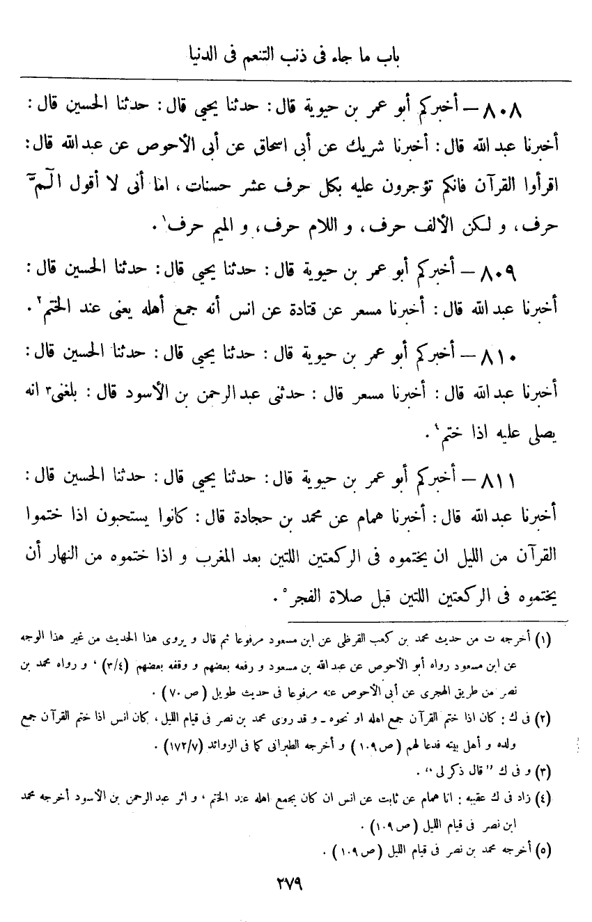 ٨١١ - أَخْبَرَكُمْ أَبُو عُمَرَ بْنُ حَيَوَيْهِ قَالَ: أَخْبَرَنَا يَحْيَى قَالَ: حَدَّثَنَا الْحُسَيْنُ قَالَ: أَخْبَرَنَا عَبْدُ اللَّهِ قَالَ: أَخْبَرَنَا هَمَّامٌ، عَنْ مُحَمَّدِ بْنِ جُحَادَةَ قَالَ: «كَانُوا يَسْتَحِبُّونَ إِذَا خَتَمُوا الْقُرْآنَ مِنَ اللَّيْلِ، أَنْ يَخْتِمُوهُ فِي الرَّكْعَتَيْنِ اللَّتَيْنِ بَعْدَ الْمَغْرِبِ، وَإِذَا خَتَمُوهُ مِنَ النَّهَارِ يَخْتِمُوهُ فِي الرَّكْعَتَيْنِ اللَّتَيْنِ قَبْلَ صَلَاةِ الْفَجْرِ»