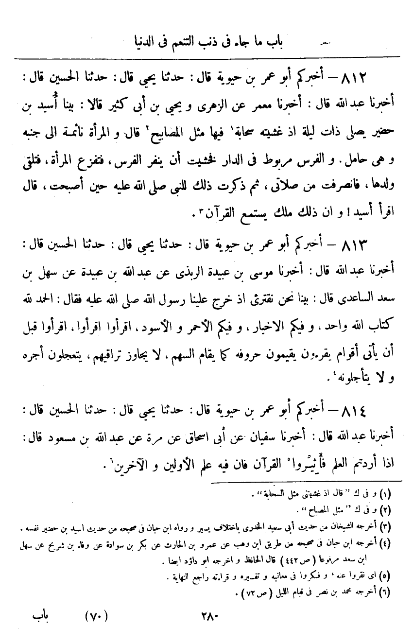 ٨١٢ - أَخْبَرَكُمْ أَبُو عُمَرَ بْنُ حَيَوَيْهِ قَالَ: أَخْبَرَنَا يَحْيَى قَالَ: حَدَّثَنَا الْحُسَيْنُ قَالَ: أَخْبَرَنَا عَبْدُ اللَّهِ قَالَ: أَخْبَرَنَا مَعْمَرٌ، عَنِ الزُّهْرِيِّ، وَيَحْيَى بْنِ أَبِي كَثِيرٍ قَالَا: بَيْنَا أُسَيْدُ بْنُ حُضَيْرٍ يُصَلِّي ذَاتَ لَيْلَةٍ إِذْ غَشِيَتْهُ سَحَابَةٌ، فِيهَا مِثْلُ الْمَصَابِيحِ "، قَالَ: وَالْمَرْأَةُ نَائِمَةٌ إِلَى جَنْبِهِ، وَهِيَ حَامِلٌ، وَالْفَرَسُ مَرْبُوطٌ فِي الدَّارِ، فَخَشِيتُ أَنْ يَنْفِرَ الْفَرَسُ؛ فَتَفْزَعَ الْمَرْأَةُ؛ فَتُلْقِيَ وَلَدَهَا، فَانْصَرَفْتُ مِنْ صَلَاتِي، ثُمَّ ذَكَرْتُ ذَلِكَ لِلنَّبِيِّ صَلَّى اللهُ عَلَيْهِ وَسَلَّمَ حِينَ أَصْبَحْتُ، قَالَ: «اقْرَأْ أُسَيْدُ، وَإِنَّ ذَلِكَ مَلَكٌ يَسْتَمِعُ الْقُرْآنَ»