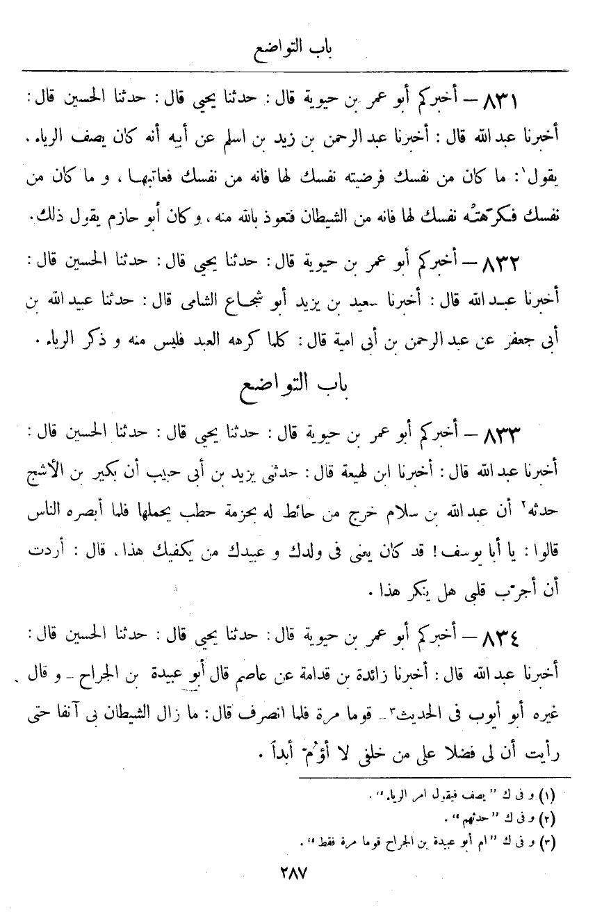 ٨٣١ - أَخْبَرَكُمْ أَبُو عُمَرَ بْنُ حَيَوَيْهِ قَالَ: أَخْبَرَنَا يَحْيَى قَالَ: حَدَّثَنَا الْحُسَيْنُ قَالَ: أَخْبَرَنَا عَبْدُ اللَّهِ قَالَ: أَخْبَرَنَا عَبْدُ الرَّحْمَنِ بْنُ زَيْدِ بْنِ أَسْلَمَ، عَنْ أَبِيهِ أَنَّهُ كَانَ يَصِفُ الرِّيَاءَ، يَقُولُ: «مَا كَانَ مِنْ نَفْسِكَ فَرَضِيَتْهُ نَفْسُكَ لَهَا، فَإِنَّهُ مِنْ نَفْسِكَ فَعَاتِبْهَا، وَمَا كَانَ مِنْ نَفْسِكَ فَكَرِهَتْهُ نَفْسُكَ لَهَا، فَإِنَّهُ مِنَ الشَّيْطَانِ، فَتَعَوَّذْ بِاللَّهِ مِنْهُ» ، وَكَانَ أَبُو حَازِمٍ يَقُولُ ذَلِكَ