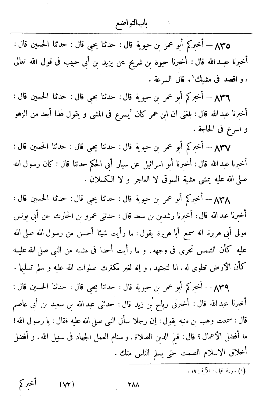 ٨٣٥ - أَخْبَرَكُمْ أَبُو عُمَرَ بْنُ حَيَوَيْهِ قَالَ: أَخْبَرَنَا يَحْيَى قَالَ: حَدَّثَنَا الْحُسَيْنُ قَالَ: أَخْبَرَنَا عَبْدُ اللَّهِ قَالَ: أَخْبَرَنَا حَيْوَةُ بْنُ شُرَيْحٍ، عَنْ يَزِيدَ بْنِ أَبِي حَبِيبٍ فِي قَوْلِ اللَّهِ تَعَالَى: {وَاقْصُدْ فِي مَشْيِكَ} [لقمان: ١٩] قَالَ: «السُّرْعَةُ»