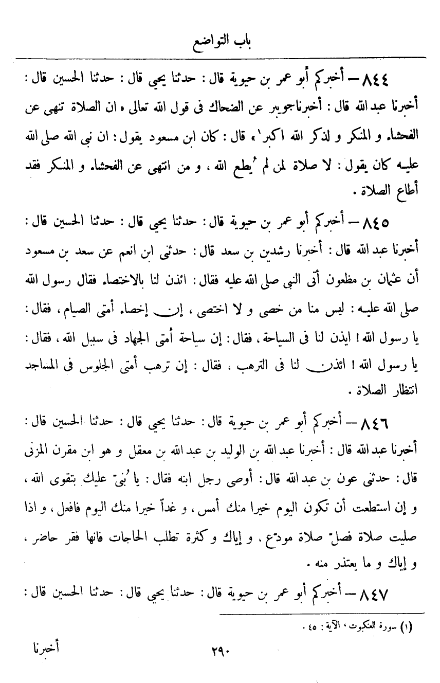 ٨٤٤ - أَخْبَرَكُمْ أَبُو عُمَرَ بْنُ حَيَوَيْهِ قَالَ: أَخْبَرَنَا يَحْيَى قَالَ: حَدَّثَنَا الْحُسَيْنُ قَالَ: أَخْبَرَنَا عَبْدُ اللَّهِ قَالَ: أَخْبَرَنَا جُوَيْبِرٌ، عَنِ الضَّحَّاكِ فِي قَوْلِ اللَّهِ تَعَالَى: {إِنَّ الصَّلَاةَ تَنْهَى عَنِ الْفَحْشَاءِ وَالْمُنْكَرِ وَلَذِكْرُ اللَّهِ أَكْبَرُ} [العنكبوت: ٤٥] قَالَ: كَانَ ابْنُ مَسْعُودٍ يَقُولُ: إِنَّ نَبِيَّ اللَّهِ صَلَّى اللهُ عَلَيْهِ وَسَلَّمَ كَانَ يَقُولُ: «لَا صَلَاةَ لِمَنْ لَمْ يُطِعِ اللَّهَ، وَمَنِ انْتَهَى عَنِ الْفَحْشَاءِ وَالْمُنْكَرِ فَقَدْ أَطَاعَ الصَّلَاةَ»