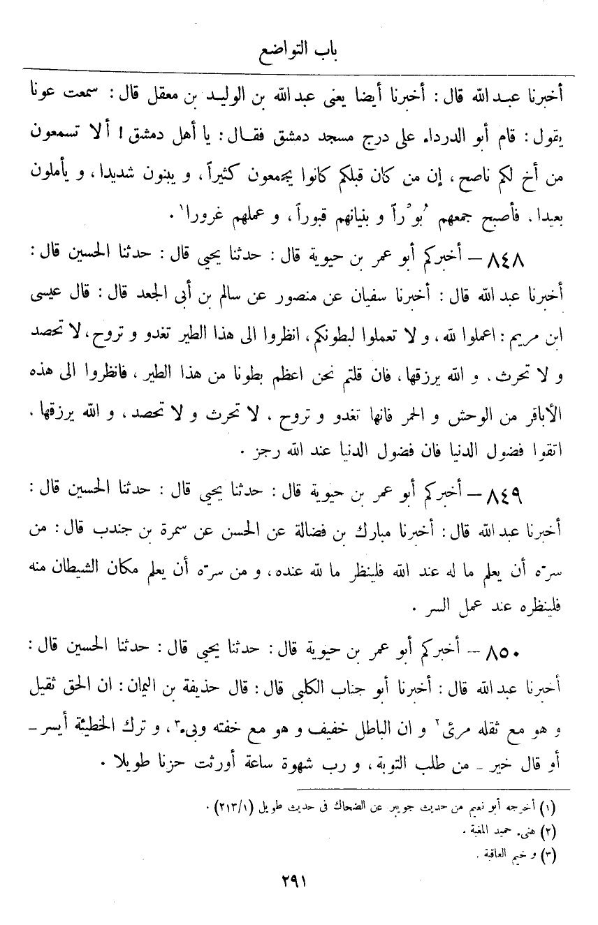 ٨٤٨ - أَخْبَرَكُمْ أَبُو عُمَرَ بْنُ حَيَوَيْهِ قَالَ: أَخْبَرَنَا يَحْيَى قَالَ: حَدَّثَنَا الْحُسَيْنُ قَالَ: أَخْبَرَنَا عَبْدُ اللَّهِ قَالَ: أَخْبَرَنَا سُفْيَانُ، عَنْ مَنْصُورٍ، عَنْ سَالِمِ بْنِ أَبِي الْجَعْدِ قَالَ: " قَالَ عِيسَى ابْنُ مَرْيَمَ: اعْمَلُوا لِلَّهِ، وَلَا تَعْمَلُوا لِبُطُونِكُمْ، انْظُرُوا إِلَى هَذَا الطَّيْرِ؛ تَغْدُو وَتَرُوحُ، لَا تَحْصُدُ، وَلَا تَحْرُثُ، وَاللَّهُ يَرْزُقُهَا، فَإِنْ قُلْتُمْ: نَحْنُ أَعْظَمُ بُطُونًا مِنْ هَذَا الطَّيْرِ، فَانْظُرُوا إِلَى هَذِهِ الْأَبَاقِرِ مِنَ الْوَحْشِ، وَالْحُمُرِ، فَإِنَّهَا تَغْدُو وَتَرُوحُ، لَا تَحْرُثُ، وَلَا تَحْصُدُ، وَاللَّهُ يَرْزُقُهَا، اتَّقُوا فُضُولَ الدُّنْيَا، فَإِنَّ فُضُولَ الدُّنْيَا عِنْدَ اللَّهِ رِجْزٌ "