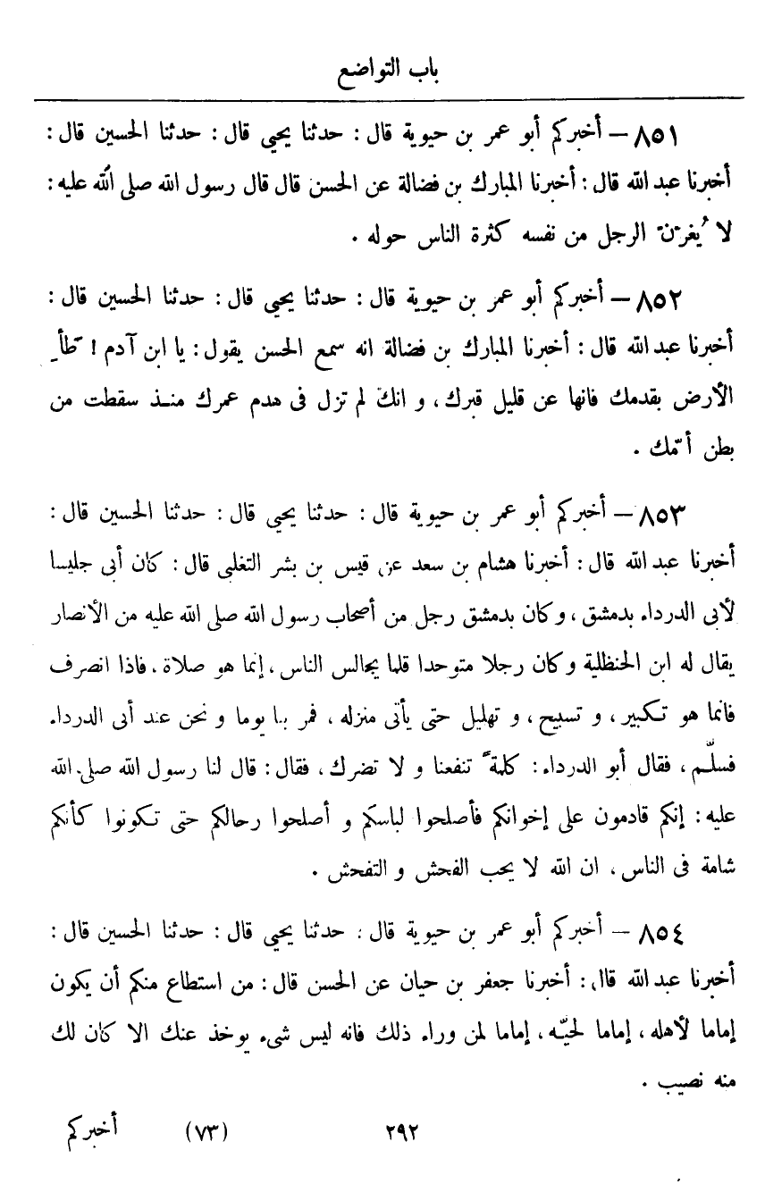 ٨٥٢ - أَخْبَرَكُمْ أَبُو عُمَرَ بْنُ حَيَوَيْهِ قَالَ: أَخْبَرَنَا يَحْيَى قَالَ: حَدَّثَنَا الْحُسَيْنُ قَالَ: أَخْبَرَنَا عَبْدُ اللَّهِ قَالَ: أَخْبَرَنَا الْمُبَارَكُ بْنُ فَضَالَةَ أَنَّهُ سَمِعَ الْحَسَنَ يَقُولُ: «يَا ابْنَ آدَمَ، طَأِ الْأَرْضَ بِقَدَمِكَ، فَإِنَّهَا عَنْ قَلِيلٍ قَبْرُكَ، وَإِنَّكَ لَمْ تَزَلْ فِي هَدْمِ عُمُرِكَ مُنْذُ سَقَطْتَ مِنْ بَطْنِ أُمِّكَ»