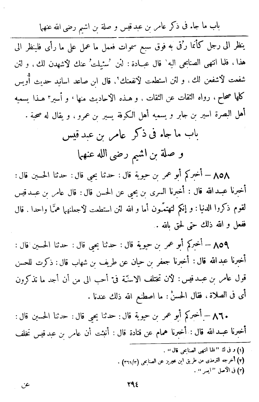 بَابُ مَا جَاءَ فِي ذِكْرِ عَامِرِ بْنِ عَبْدِ قَيْسٍ، وَصِلَةَ بْنِ أَشْيَمَ رَضِيَ اللَّهُ عَنْهُمَا