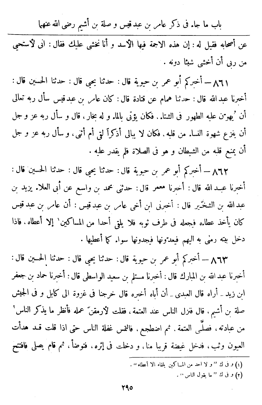 أَخْبَرَكُمْ أَبُو عُمَرَ بْنُ حَيَوَيْهِ قَالَ: أَخْبَرَنَا يَحْيَى قَالَ: حَدَّثَنَا الْحُسَيْنُ قَالَ: أَخْبَرَنَا عَبْدُ اللَّهِ قَالَ: حَدَّثَنَا هَمَّامٌ، عَنْ قَتَادَةَ قَالَ: كَانَ عَامِرُ بْنُ عَبْدِ قَيْسٍ «سَأَلَ رَبَّهُ تَعَالَى أَنْ يُهَوِّنَ عَلَيْهِ الطَّهُورَ فِي الشِّتَاءِ، فَكَانَ يُؤْتَى بِالْمَاءِ وَلَهُ بُخَارٌ» ، قَالَ: «وَسَأَلَ رَبَّهُ عَزَّ وَجَلَّ أَنْ يَنْزِعَ شَهْوَةَ النِّسَاءِ مِنْ قَلْبِهِ، فَكَانَ لَا يُبَالِي أَذَكَرًا لَقِيَ أَمْ أُنْثَى، وَسَأَلَ رَبَّهُ عَزَّ وَجَلَّ أَنْ يَمْنَعَ قَلْبَهُ مِنَ الشَّيْطَانِ، وَهُوَ فِي الصَّلَاةِ فَلَمْ يَقْدِرْ عَلَيْهِ»