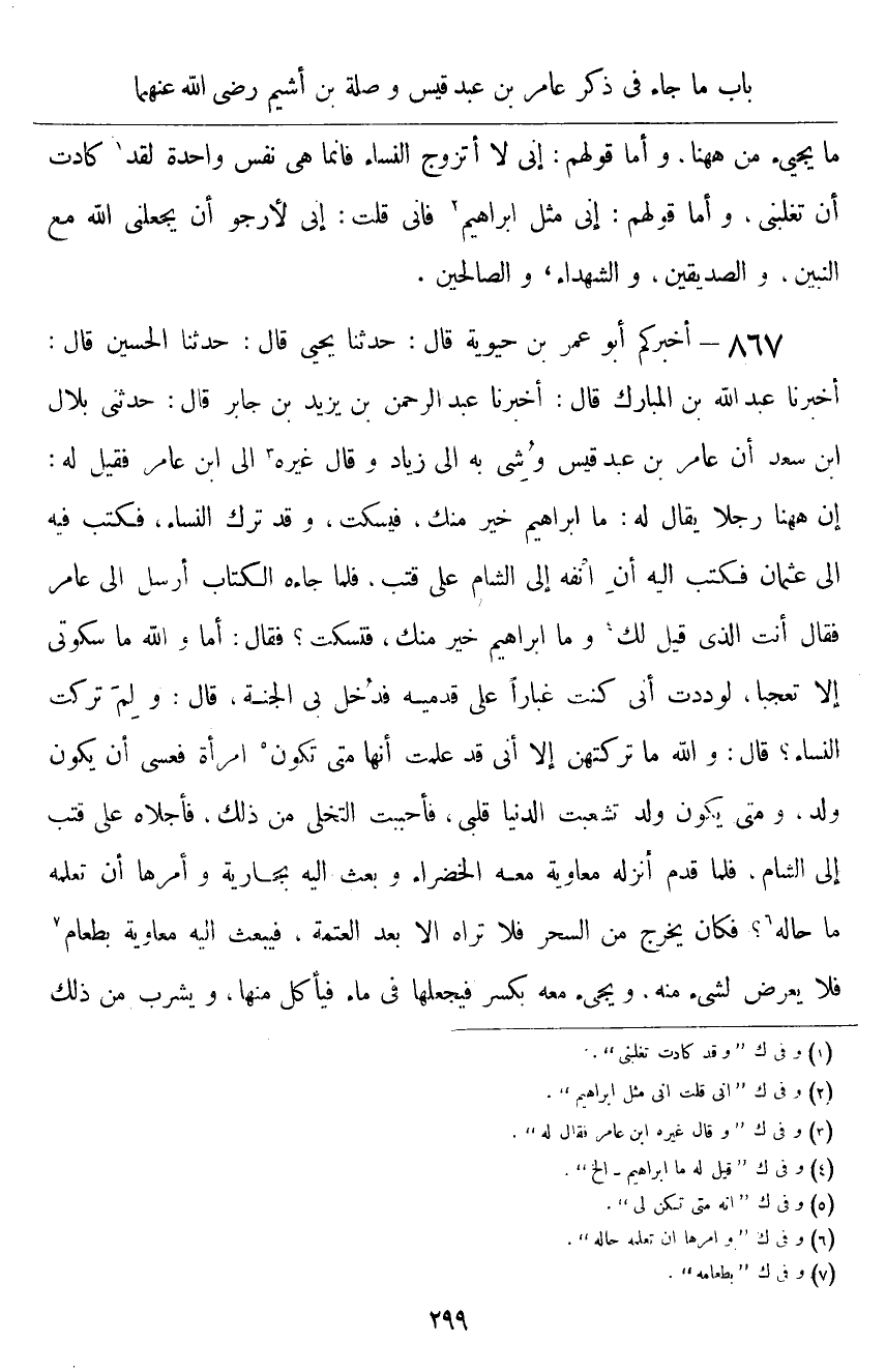 ٨٦٧ - أَخْبَرَكُمْ أَبُو عُمَرَ بْنُ حَيَوَيْهِ قَالَ: أَخْبَرَنَا يَحْيَى قَالَ: حَدَّثَنَا الْحُسَيْنُ قَالَ: أَخْبَرَنَا عَبْدُ اللَّهِ بْنُ الْمُبَارَكِ قَالَ: أَخْبَرَنَا عَبْدُ الرَّحْمَنِ بْنُ يَزِيدَ بْنِ جَابِرٍ قَالَ: حَدَّثَنِي بِلَالُ بْنُ سَعْدٍ أَنَّ عَامِرَ بْنَ عَبْدِ قَيْسٍ، وُشِيَ بِهِ إِلَى زِيَادٍ - وَقَالَ غَيْرُهُ: إِلَى ابْنِ عَامِرٍ - فَقِيلَ لَهُ: إِنَّ هَهُنَا رَجُلًا يُقَالُ لَهُ: مَا إِبْرَاهِيمُ خَيْرٌ مِنْكَ، فَيَسْكُتُ، وَقَدْ تَرَكَ النِّسَاءَ، فَكَتَبَ فِيهِ إِلَى عُثْمَانَ، فَكَتَبَ إِلَيْهِ: «أَنْ أَنْفِهِ إِلَى الشَّامِ عَلَى قَتَبٍ» ، فَلَمَّا جَاءَهُ الْكِتَابُ أَرْسَلَ إِلَى عَامِرٍ، فَقَالَ: أَنْتَ الَّذِي قِيلَ لَكَ: مَا إِبْرَاهِيمُ خَيْرٌ مِنْكَ، فَتَسْكُتُ، فَقَالَ: أَمَا وَاللَّهِ مَا سُكُوتِي إِلَّا تَعَجُّبًا، لَوَدِدْتُ أَنِّي كُنْتُ غُبَارًا عَلَى قَدَمَيْهِ، فَدَخَلَ بِيَ الْجَنَّةَ قَالَ: وَلِمَ تَرَكْتَ النِّسَاءَ؟ قَالَ: وَاللَّهِ مَا تَرَكْتُهُنَّ إِلَّا أَنِّي قَدْ عَلِمْتُ أَنَّهَا مَتَى تَكُونُ امْرَأَةٌ فَعَسَى أَنْ يَكُونَ وَلَدٌ، وَمَتَى يَكُونُ وَلَدٌ تَشَعَّبَتِ الدُّنْيَا قَلْبِي، فَأَحْبَبْتُ التَّخَلِّيَّ مِنْ ذَلِكَ، فَأَجْلَاهُ عَلَى قَتَبٍ إِلَى الشَّامِ، فَلَمَّا قَدِمَ أَنْزَلَهُ مُعَاوِيَةُ مَعَهُ الْخَضْرَاءَ، وَبَعَثَ إِلَيْهِ بِجَارِيَةٍ، وَأَمَرَهَا أَنْ تُعْلِمَهُ مَا حَالُهُ؟ فَكَانَ يَخْرُجُ مِنَ السَّحَرِ، فَلَا تَرَاهُ إِلَّا بَعْدَ الْعَتَمَةِ، فَيَبْعَثُ إِلَيْهِ مُعَاوِيَةُ بِطَعَامٍ، فَلَا يَعْرِضُ لِشَيْءٍ مِنْهُ، وَيَجِيءُ مَعَهُ بِكِسَرٍ، فَيَجْعَلُهَا فِي مَاءٍ، فَيَأْكُلُ مِنْهَا، وَيَشْرَبُ مِنْ ذَلِكَ ⦗٣٠٠⦘ الْمَاءِ، ثُمَّ يَقُومُ، فَلَا يَزَالُ ذَلِكَ مُقَامَهُ حَتَّى يَسْمَعَ النِّدَاءَ فَيَخْرُجَ، فَلَا تَرَاهُ إِلَى مِثْلِهَا، فَكَتَبَ مُعَاوِيَةُ إِلَى عُثْمَانَ يَذْكُرُ لَهُ حَالَهُ، فَكَتَبَ إِلَيْهِ: «أَنِ اجْعَلْهُ أَوَّلَ دَاخِلٍ، وَآخِرَ خَارِجٍ، وَمُرْ لَهُ بِعَشَرَةٍ مِنَ الرَّقِيقِ، وَعَشَرَةٍ مِنَ الظَّهْرِ» ، فَلَمَّا أَتَى مُعَاوِيَةَ الْكِتَابُ أَرْسَلَ إِلَيْهِ، فَقَالَ لَهُ: إِنَّ أَمِيرَ الْمُؤْمِنِينَ كَتَبَ إِلَيَّ: أَنْ آمُرَ لَكَ بِعَشَرَةٍ مِنَ الرَّقِيقِ، فَقَالَ: إِنَّ عَلَيَّ شَيْطَانًا قَدْ غَلَبَنِي، فَكَيْفَ أَجْمَعُ عَلَيَّ عَشَرَةً؟ قَالَ: وَأَمَرَ لَكَ بِعَشَرَةٍ مِنَ الظَّهْرِ، قَالَ: إِنَّ لِي لَبَغْلَةً وَاحِدَةً، وَإِنِّي لَمُشْفِقٌ أَنْ يَسْأَلَنِي اللَّهُ عَزَّ وَجَلَّ، عَنْ فَضْلِ ظَهْرِهَا يَوْمَ الْقِيَامَةِ، قَالَ: وَأَمَرَنِي أَنْ أَجْعَلَكَ أَوَّلَ دَاخِلٍ، وَآخِرَ خَارِجٍ، قَالَ: " لَا أَرَبَ لِي فِي ذَلِكَ، قَالَ: فَحَدَّثَ بِلَالُ بْنُ سَعْدٍ عَمَّا رَآهُ بِأَرْضِ الرُّومِ عَلَى بَغْلَتِهِ تِلْكَ، يَرْكَبُهَا عُقْبَةُ، وَيَحْمِلُ عَلَيْهَا الْمُهَاجِرِينَ عُقْبَةُ، قَالَ: وَحَدَّثَنَا بِلَالُ بْنُ سَعْدٍ أَنَّ عَامِرًا كَانَ إِذَا فَصَلَ غَازِيًا وَقَفَ يَتَوَسَّمُ الرِّفَاقَ، فَإِنْ رَأَى رِفْقَةً تُوَافِقُهُ قَالَ: يَا هَؤُلَاءِ، إِنِّي أُرِيدُ أَنْ أَصْحَبَكُمْ عَلَى أَنْ تُعْطُونِي مِنْ أَنْفُسِكُمْ ثَلَاثَ خِلَالٍ، فَيَقُولُونَ: وَمَا هِيَ؟ قَالَ: أَكُونُ لَكُمْ خَادِمًا لَا يُنَازِعُنِي أَحَدٌ مِنْكُمُ الْخِدْمَةَ، وَأَكُونُ مُؤَذِّنًا لَا يُنَازِعُنِي أَحَدٌ مِنْكُمُ الْأَذَانَ، وَأُنْفِقُ عَلَيْكُمْ بِقَدْرِ طَاقَتِي؟ فَإِذَا قَالُوا لَهُ: نَعَمْ، انْضَمَّ إِلَيْهِمْ، وَإِنْ نَازَعَهُ أَحَدٌ مِنْهُمْ شَيْئًا مِنْ ذَلِكَ، ارْتَحَلَ مِنْهُمْ إِلَى غَيْرِهِمْ