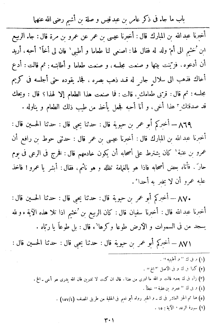 ٨٧١ - أَخْبَرَكُمْ أَبُو عُمَرَ بْنُ حَيَوَيْهِ قَالَ: أَخْبَرَنَا يَحْيَى قَالَ: حَدَّثَنَا الْحُسَيْنُ ⦗٣٠٢⦘ قَالَ: أَخْبَرَنَا عَبْدُ اللَّهِ بْنُ الْمُبَارَكِ قَالَ: أَخْبَرَنَا عِيسَى بْنُ عُمَرَ قَالَ: حَدَّثَنِي عَمْرُو بْنُ مُرَّةَ قَالَ: كَانَ رَسُولُ اللَّهِ صَلَّى اللهُ عَلَيْهِ وَسَلَّمَ فِي مَسِيرٍ لَهُ فَسَمِعَ صَوْتًا، فَأَمَرَ أَصْحَابَهُ، فَوَقَفُوا، وَسَارَ حَتَّى أَشْرَفَ عَلَى رَجُلٍ فِي وَادٍ، فَإِذَا هُوَ قَدْ نَزَعَ ثِيَابَهُ، وَهُوَ يَتَرَمَّضُ فِي الرَّمْضَاءِ، فَإِذَا هُوَ يَقُولُ: أَنَوْمٌ بِاللَّيْلِ، وَبَاطِلٌ بِالنَّهَارِ، فَوَقَفَ النَّبِيُّ صَلَّى اللهُ عَلَيْهِ وَسَلَّمَ مَا شَاءَ اللَّهُ أَنْ يَقِفَ لَا يَأْتِيهِ، ثُمَّ لَبِسَ ثِيَابَهُ، فَأَتَاهُ فَسَلَّمَ عَلَيْهِ، فَقَالَ لَهُ النَّبِيُّ صَلَّى اللهُ عَلَيْهِ وَسَلَّمَ: «أَمَا رَأَيْتَنِي؟» قَالَ: بَلَى، وَلَكِنَّهُ كَانَ فِي نَفْسِي شَيْءٌ، فَلَمْ أُرِدْ أَنْ أَقُومَ حَتَّى أَقْضِيَ مَا فِي نَفْسِي - أَوْ كَمَا شَاءَ اللَّهُ أَنْ يَقُولَ - فَقَالَ رَسُولُ اللَّهِ صَلَّى اللهُ عَلَيْهِ وَسَلَّمَ: «لَقَدْ رَأَيْتُ السَّمَوَاتِ السَّبْعِ يُفْتَحْنَ لِمَا تَصْنَعُ، وَإِنَّ ذَا الْعَرْشِ سُبْحَانَهُ وَتَعَالَى لَيُبَاهِي بِهِ الْمَلَائِكَةَ» ، ثُمَّ مَضَى إِلَى أَصْحَابِهِ، فَقَالَ: «أَيُّكُمْ يَعْرِفُ هَذَا؟» فَمَا عَرَفَهُ أَحَدٌ مِنَ الْقَوْمِ إِلَّا رَجُلٌ، فَقَالَ رَسُولُ اللَّهِ صَلَّى اللهُ عَلَيْهِ وَسَلَّمَ: «تَزَوَّدُوا مِنْهُ، فَإِنَّهُ لَنْ يَلْبَثَ فِيكُمْ إِلَّا قَلِيلًا» ، فَقَالُوا: ادْعُ لَنَا، فَقَالَ: «اللَّهُمَّ اجْعَلْ زَادَهُمُ التَّقْوَى» ، قَالُوا: زِدْنَا، قَالَ: «وَأَصْلِحْ ذَاتَ بَيْنِهِمْ»