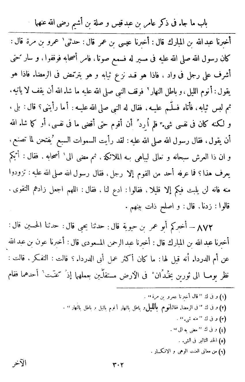 ٨٧٢ - أَخْبَرَكُمْ أَبُو عُمَرَ بْنُ حَيَوَيْهِ قَالَ: أَخْبَرَنَا يَحْيَى قَالَ: حَدَّثَنَا الْحُسَيْنُ قَالَ: أَخْبَرَنَا عَبْدُ اللَّهِ بْنُ الْمُبَارَكِ قَالَ: أَخْبَرَنَا عَبْدُ الرَّحْمَنِ الْمَسْعُودِيُّ قَالَ: أَخْبَرَنَا عَوْنُ بْنُ عَبْدِ اللَّهِ، عَنْ أُمِّ الدَّرْدَاءِ أَنَّهُ قِيلِ لَهَا: مَا كَانَ أَكْثَرُ عَمَلِ أَبِي الدَّرْدَاءِ؟ قَالَتْ: «التَّفَكُّرُ» ، قَالَتْ: " نَظَرَ يَوْمًا إِلَى ثَوْرَيْنِ يَخُدَّانِ فِي الْأَرْضِ مُسْتَقِلَّيْنِ بِعَمَلِهِمَا إِذْ عَنَتَ أَحَدُهُمَا، فَقَامَ ⦗٣٠٣⦘ الْآخَرُ، فَقَالَ أَبُو الدَّرْدَاءِ: «فِي هُنَا تَفَكُّرٌ، اسْتَقَلَّا بِعَمَلِهِمَا وَاجْتَمَعَا، فَلَمَّا عَنَتَ أَحَدُهُمَا قَامَ الْآخَرُ، كَذَلِكَ الْمُتَعَاوِنَانِ عَلَى ذِكْرِ اللَّهِ عَزَّ وَجَلَّ»