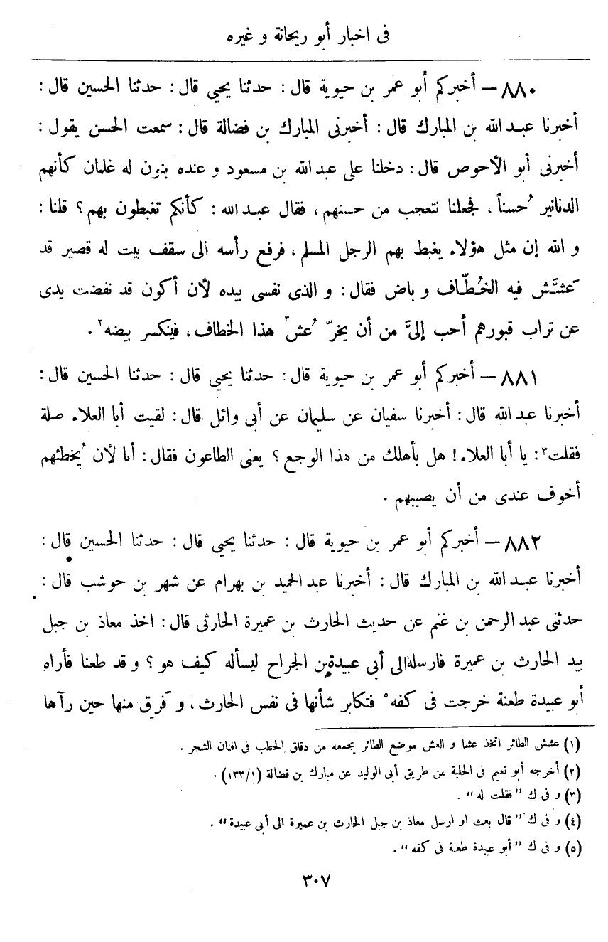 ٨٨٢ - أَخْبَرَكُمْ أَبُو عُمَرَ بْنُ حَيَوَيْهِ قَالَ: حَدَّثَنَا يَحْيَى قَالَ: حَدَّثَنَا الْحُسَيْنُ قَالَ: أَخْبَرَنَا عَبْدُ اللَّهِ بْنُ الْمُبَارَكِ قَالَ: أَخْبَرَنَا عَبْدُ الْحَمِيدِ بْنُ بَهْرَامَ، عَنْ شَهْرِ بْنِ حَوْشَبٍ قَالَ: حَدَّثَنِي عَبْدُ الرَّحْمَنِ بْنُ غَنْمٍ، عَنْ حَدِيثِ الْحَارِثِ بْنِ عَمِيرَةَ الْحَارِثِيِّ قَالَ: «أَخَذَ مُعَاذُ بْنُ جَبَلٍ بِيَدِ الْحَارِثِ بْنِ عَمِيرَةَ، فَأَرْسَلَهُ إِلَى أَبِي عُبَيْدَةَ بْنِ الْجَرَّاحِ؛ لِيَسْأَلَهُ كَيْفَ هُوَ؟ وَقَدْ طُعِنَا، فَأَرَاهُ أَبُو عُبَيْدَةَ طَعْنَةً خَرَجَتْ فِي كَفِّهِ، فَتَكَابَرَ شَأْنُهَا فِي نَفْسِ الْحَارِثِ، وَفَرِقَ مِنْهَا حِينَ رَآهَا ⦗٣٠٨⦘، فَأَقْسَمَ لَهُ أَبُو عُبَيْدَةَ بْنُ الْجَرَّاحِ بِاللَّهِ مَا يُحِبُّ أَنَّ لَهُ مَكَانَهَا حُمْرَ النَّعَمِ»