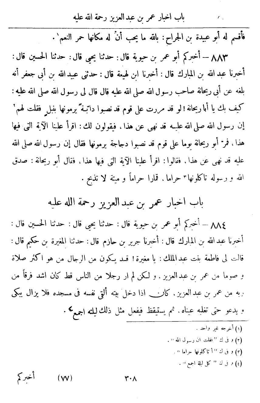 ٨٨٤ - أَخْبَرَكُمْ أَبُو عُمَرَ بْنُ حَيَوَيْهِ قَالَ: حَدَّثَنَا يَحْيَى قَالَ: حَدَّثَنَا الْحُسَيْنُ قَالَ: أَخْبَرَنَا عَبْدُ اللَّهِ بْنُ الْمُبَارَكِ قَالَ: أَخْبَرَنَا جَرِيرُ بْنُ حَازِمٍ قَالَ: حَدَّثَنَا الْمُغِيرَةُ بْنُ حَكِيمٍ قَالَ: قَالَتْ لِي فَاطِمَةُ بِنْتُ عَبْدُ الْمَلِكِ: «يَا مُغِيرَةُ، قَدْ يَكُونُ مِنَ الرِّجَالِ مَنْ هُوَ أَكْثَرُ صَلَاةً وَصَوْمًا مِنْ عُمَرَ بْنِ عَبْدِ الْعَزِيزِ، وَلَكِنْ لَمْ أَرَ رَجُلًا مِنَ النَّاسِ قَطُّ كَانَ أَشَدَّ فَرَقًا مِنْ رَبِّهِ مِنْ عُمَرَ بْنِ عَبْدِ الْعَزِيزِ، كَانَ إِذَا دَخَلَ بَيْتَهُ أَلْقَى نَفْسَهُ فِي مَسْجِدِهِ، فَلَا يَزَالُ يَبْكِي، وَيَدْعُو حَتَّى تَغْلِبَهُ عَيْنَاهُ، ثُمَّ يَسْتَيْقِظُ، فَيَفْعَلُ مِثْلَ ذَلِكَ لَيْلَتَهُ أَجْمَعَ»