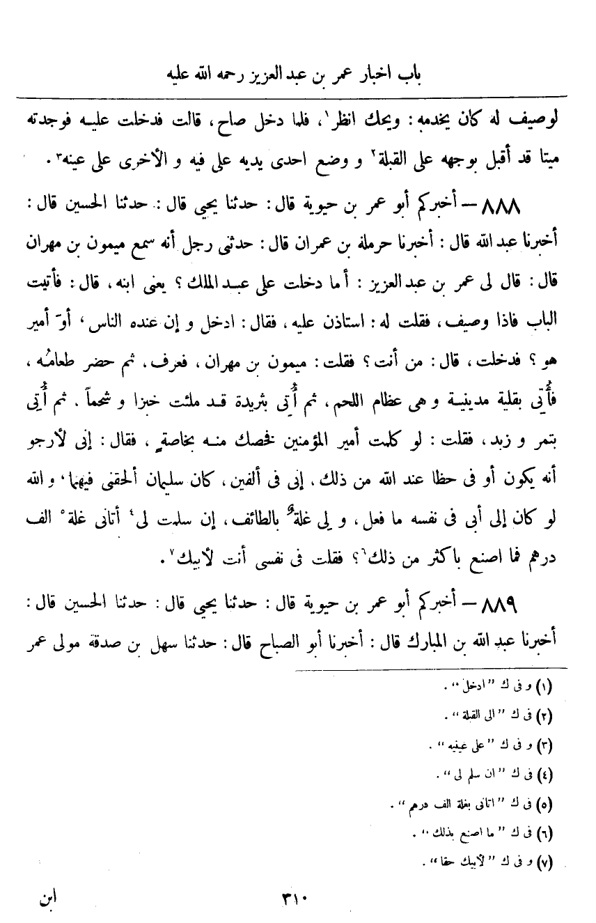 ٨٨٨ - أَخْبَرَكُمْ أَبُو عُمَرَ بْنُ حَيَوَيْهِ قَالَ: حَدَّثَنَا يَحْيَى قَالَ: حَدَّثَنَا الْحُسَيْنُ قَالَ: أَخْبَرَنَا عَبْدُ اللَّهِ قَالَ: أَخْبَرَنَا حَرْمَلَةُ بْنُ عِمْرَانَ قَالَ: حَدَّثَنِي رَجُلٌ أَنَّهُ سَمِعَ مَيْمُونَ بْنَ مِهْرَانَ قَالَ: قَالَ لِي عُمَرُ بْنُ عَبْدِ الْعَزِيزِ: أَمَا دَخَلْتَ عَلَى عَبْدِ الْمَلِكِ؟ يَعْنِي ابْنَهُ، قَالَ: فَأَتَيْتُ الْبَابَ، فَإِذَا وَصِيفٌ، فَقُلْتُ لَهُ: اسْتَأْذِنْ عَلَيْهِ، فَقَالَ: «ادْخُلْ، وَإِنَّ عِنْدَهُ النَّاسَ، أَوَ أَمِيرٌ هُوَ؟» فَدَخَلْتُ، قَالَ: مَنْ أَنْتَ؟ فَقُلْتُ: " مَيْمُونُ بْنُ مِهْرَانَ، فَعَرَفَ، ثُمَّ حَضَرَ طَعَامُهُ، فَأُتِيَ بِقَلِيَّةٍ مَدِينِيَّةٍ، وَهِيَ عِظَامُ اللَّحْمِ، ثُمَّ أُتِيَ بِثَرِيدَةٍ قَدْ مُلِئَتْ خُبْزًا وَشَحْمًا، ثُمَّ أُتِيَ بِتَمْرٍ وَزُبْدٍ، فَقُلْتُ: لَوْ كَلَّمْتَ أَمِيرَ الْمُؤْمِنِينَ فَخَصَّكَ مِنْهُ بِخَاصَّةٍ، فَقَالَ: إِنِّي لَأَرْجُو أَنَّهُ يَكُونُ أَوْفَى حَظًّا عِنْدَ اللَّهِ مِنْ ذَلِكَ، إِنِّي فِي أَلْفَيْنِ، كَانَ سُلَيْمَانُ أَلْحَقَنِي فِيهِمَا، وَاللَّهِ لَوْ كَانَ إِلَى أَبِي فِي نَفْسِهِ مَا فَعَلَ، وَلِي غَلَّةٌ بِالطَّائِفِ، إِنْ سَلِمَتْ لِي أَتَانِي غَلَّةٌ أَلْفُ دِرْهَمٍ، فَمَا أَصْنَعُ بِذَلِكَ؟ فَقُلْتُ فِي نَفْسِي: أَنْتَ لِأَبِيكَ