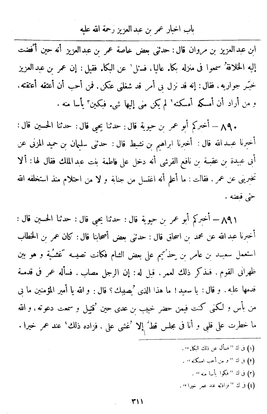 ٨٩٠ - أَخْبَرَنَا إِبْرَاهِيمُ بْنُ نَشِيطٍ قَالَ: حَدَّثَنِي سُلَيْمَانُ بْنُ حُمَيْدٍ الْمُزَنِيُّ، عَنْ أَبِي عُبَيْدَةَ بْنِ عُقْبَةَ بْنِ نَافِعٍ الْقُرَشِيِّ أَنَّهُ دَخَلَ عَلَى فَاطِمَةَ بِنْتِ عَبْدِ الْمَلِكِ، فَقَالَ لَهَا: أَلَا تُخْبِرِينِي عَنْ عُمَرَ؟ فَقَالَتْ: «مَا أَعْلَمُ أَنَّهُ اغْتَسَلَ مِنْ جَنَابَةٍ، وَلَا مِنِ احْتِلَامٍ مُنْذُ اسْتَخْلَفَهُ اللَّهُ حَتَّى قَبَضَهُ»