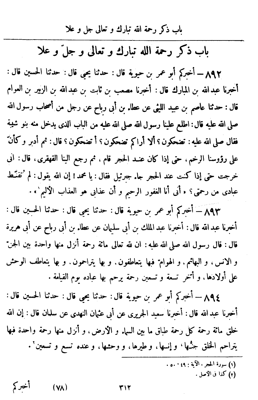 ٨٩٣ - أَخْبَرَكُمْ أَبُو عُمَرَ بْنُ حَيَوَيْهِ قَالَ: حَدَّثَنَا يَحْيَى قَالَ: حَدَّثَنَا الْحُسَيْنُ قَالَ: أَخْبَرَنَا عَبْدُ اللَّهِ قَالَ: أَخْبَرَنَا عَبْدُ الْمَلِكِ بْنُ أَبِي سُلَيْمَانَ، عَنْ عَطَاءِ بْنِ أَبِي رَبَاحٍ، عَنْ أَبِي هُرَيْرَةَ قَالَ: قَالَ رَسُولُ اللَّهِ صَلَّى اللهُ عَلَيْهِ وَسَلَّمَ: «إِنَّ لِلَّهِ تَعَالَى مِائَةَ رَحْمَةٍ، أَنْزَلَ مِنْهَا وَاحِدَةً بَيْنَ الْجِنِّ، وَالْإِنْسِ، وَالْبَهَائِمِ، وَالْهَوَامِّ، فَبِهَا يَتَعَاطَفُونَ، وَبِهَا يَتَرَاحَمُونَ، وَبِهَا يَتَعَاطَفُ الْوَحْشُ عَلَى أَوْلَادِهَا، وَأَخَّرَ تِسْعًا وَتِسْعِينَ رَحْمَةً يَرْحَمُ بِهَا عِبَادَهُ يَوْمَ الْقِيَامَةِ»