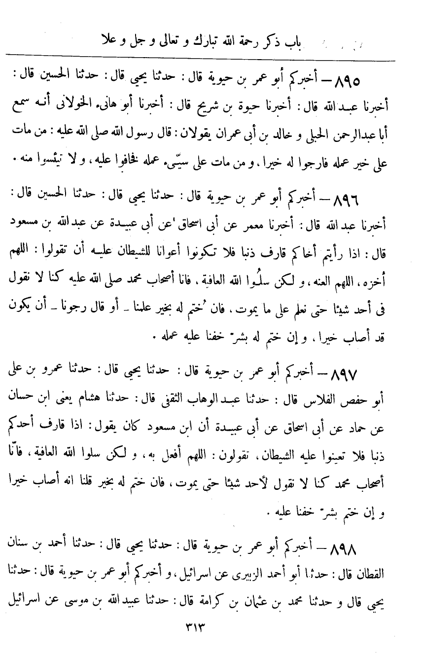 ٨٩٥ - أَخْبَرَكُمْ أَبُو عُمَرَ بْنُ حَيَوَيْهِ قَالَ: حَدَّثَنَا يَحْيَى قَالَ: حَدَّثَنَا الْحُسَيْنُ قَالَ: أَخْبَرَنَا عَبْدُ اللَّهِ قَالَ: أَخْبَرَنَا حَيْوَةُ بْنُ شُرَيْحٍ قَالَ: أَخْبَرَنَا أَبُو هَانِئٍ الْخَوْلَانِيُّ أَنَّهُ سَمِعَ أَبَا عَبْدِ الرَّحْمَنِ الْحُبُلِيَّ، وَخَالِدَ بْنَ أَبِي عِمْرَانَ يَقُولَانِ: قَالَ رَسُولُ اللَّهِ صَلَّى اللهُ عَلَيْهِ وَسَلَّمَ: «مَنْ مَاتَ عَلَى خَيْرِ عَمَلِهِ، فَأَرْجُو لَهُ خَيْرًا، وَمَنْ مَاتَ عَلَى سَيِّئِ عَمَلِهِ، فَخَافُوا عَلَيْهِ، وَلَا تَيْئَسُوا مِنْهُ»
