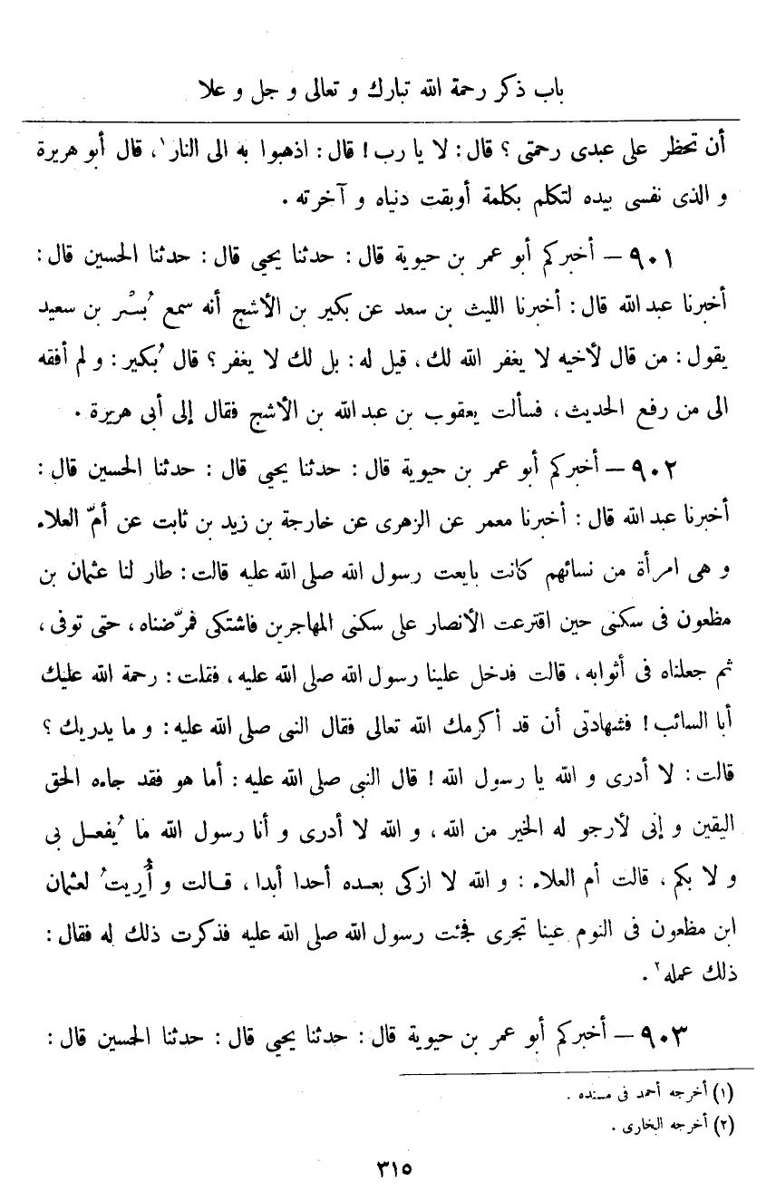 ٩٠٢ - أَخْبَرَكُمْ أَبُو عُمَرَ بْنُ حَيَوَيْهِ قَالَ: حَدَّثَنَا يَحْيَى قَالَ: حَدَّثَنَا الْحُسَيْنُ قَالَ: أَخْبَرَنَا عَبْدُ اللَّهِ قَالَ: أَخْبَرَنَا مَعْمَرٌ، عَنِ الزُّهْرِيِّ، عَنْ خَارِجَةَ بْنِ زَيْدِ بْنِ ثَابِتٍ، عَنْ أُمِّ الْعَلَاءِ، وَهِيَ امْرَأَةٌ مِنْ نِسَائِهِمْ، كَانَتْ بَايَعَتْ رَسُولَ اللَّهِ صَلَّى اللهُ عَلَيْهِ وَسَلَّمَ، قَالَتْ: طَارَ لَنَا عُثْمَانُ بْنُ مَظْعُونٍ فِي سُكْنَى حِينَ اقْتَرَعَتِ الْأَنْصَارُ عَلَى سُكْنَى الْمُهَاجِرِينَ، فَاشْتَكَى، فَمَرَّضَنَاهُ حَتَّى تُوُفِّيَ، ثُمَّ جَعَلْنَاهُ فِي أَثْوَابِهِ، قَالَتْ: فَدَخَلَ عَلَيْنَا رَسُولُ اللَّهِ صَلَّى اللهُ عَلَيْهِ وَسَلَّمَ، فَقُلْتُ: رَحْمَةُ اللَّهِ عَلَيْكَ أَبَا السَّائِبِ، فَشَهَادَتِي أَنْ قَدْ أَكْرَمَكَ اللَّهُ تَعَالَى، فَقَالَ النَّبِيُّ صَلَّى اللهُ عَلَيْهِ وَسَلَّمَ: «وَمَا يُدْرِيكِ؟» قَالَتْ: لَا أَدْرِي وَاللَّهِ يَا رَسُولَ اللَّهِ، قَالَ النَّبِيُّ صَلَّى اللهُ عَلَيْهِ وَسَلَّمَ: «أَمَّا هُوَ فَقَدْ جَاءَهُ الْحَقُّ الْيَقِينُ، وَإِنِّي لَأَرْجُو لَهُ الْخَيْرَ مِنَ اللَّهِ، وَاللَّهِ لَا أَدْرِي، وَأَنَا رَسُولُ اللَّهِ مَا يُفْعَلُ بِي، وَلَا بِكُمْ» ، قَالَتْ أُمُّ الْعَلَاءِ: وَاللَّهِ لَا أُزَكِّي بَعْدَهُ أَحَدًا أَبَدًا، قَالَتْ: وَأُرِيتُ لِعُثْمَانَ بْنِ مَظْعُونٍ فِي النَّوْمِ عَيْنًا تَجْرِي، فَجِئْتُ رَسُولَ اللَّهِ صَلَّى اللهُ عَلَيْهِ وَسَلَّمَ فَذَكَرْتُ ذَلِكَ لَهُ، فَقَالَ: «ذَلِكَ عَمَلُهُ»