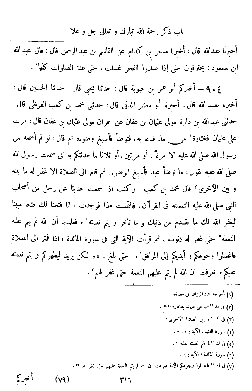 ٩٠٤ - أَخْبَرَكُمْ أَبُو عُمَرَ بْنُ حَيَوَيْهِ قَالَ: حَدَّثَنَا يَحْيَى قَالَ: حَدَّثَنَا الْحُسَيْنُ قَالَ: أَخْبَرَنَا عَبْدُ اللَّهِ قَالَ: أَخْبَرَنَا أَبُو مَعْشَرٍ الْمَدَنِيُّ قَالَ: حَدَّثَنِي مُحَمَّدُ بْنُ كَعْبٍ الْقُرَظِيُّ قَالَ: حَدَّثَنِي عَبْدُ اللَّهِ بْنُ دَارَةَ مَوْلَى عُثْمَانَ بْنِ عَفَّانَ، عَنْ حُمْرَانَ مَوْلَى عُثْمَانَ بْنِ عَفَّانَ قَالَ: مُرَّتْ عَلَى عُثْمَانَ فَخَّارَةٌ مِنْ مَاءٍ فَدَعَا بِهِ، فَتَوَضَّأَ، فَأَسْبَغَ وُضُوءَهُ، ثُمَّ قَالَ: لَوْ لَمْ أَسْمَعْهُ مِنْ رَسُولِ اللَّهِ صَلَّى اللهُ عَلَيْهِ وَسَلَّمَ إِلَّا مَرَّةً أَوْ مَرَّتَيْنِ أَوْ ثَلَاثًا مَا حَدَّثْتُكُمْ بِهِ، إِنِّي سَمِعْتُ رَسُولَ اللَّهِ صَلَّى اللهُ عَلَيْهِ وَسَلَّمَ يَقُولُ: «مَا تَوَضَّأَ عَبْدٌ فَأَسْبَغَ الْوُضُوءَ، ثُمَّ قَامَ إِلَى الصَّلَاةِ، إِلَّا غُفِرَ لَهُ مَا بَيْنَهُ وَبَيْنَ الْأُخْرَى» ، قَالَ مُحَمَّدُ بْنُ كَعْبٍ: " وَكُنْتُ إِذَا سَمِعْتُ حَدِيثًا عَنْ رَجُلٍ مِنْ أَصْحَابِ النَّبِيِّ صَلَّى اللهُ عَلَيْهِ وَسَلَّمَ الْتَمَسْتُهُ فِي الْقُرْآنِ، فَالْتَمَسْتُ هَذَا فَوَجَدْتُ: {إِنَّا فَتَحْنَا لَكَ فَتْحًا مُبِينًا لِيَغْفِرَ اللَّهُ لَكَ مَا تَقَدَّمَ مِنْ ذَنْبِكَ وَمَا تَأَخَّرَ وَيُتِمَّ نِعْمَتَهُ} ، فَعَلِمْتُ أَنَّ اللَّهَ لَمْ يُتِمَّ عَلَيْهِ النِّعْمَةَ حَتَّى غَفَرَ لَهُ ذُنُوبَهُ، ثُمَّ قَرَأْتُ الْآيَةَ الَّتِي فِي سُورَةِ الْمَائِدَةِ {إِذَا قُمْتُمْ إِلَى الصَّلَاةِ فَاغْسِلُوا وُجُوهَكُمْ وَأَيْدِيَكُمْ إِلَى الْمَرَافِقِ} [المائدة: ٦]- حَتَّى بَلَغَ - {وَلَكِنْ يُرِيدُ لِيُطَهِّرَكُمْ وَلِيُتِمَّ نِعْمَتَهُ عَلَيْكُمْ} [المائدة: ٦] ، فَعَرَفْتُ أَنَّ اللَّهَ لَمْ يُتِمَّ عَلَيْهِمِ النِّعْمَةَ حَتَّى غَفَرَ لَهُمْ "