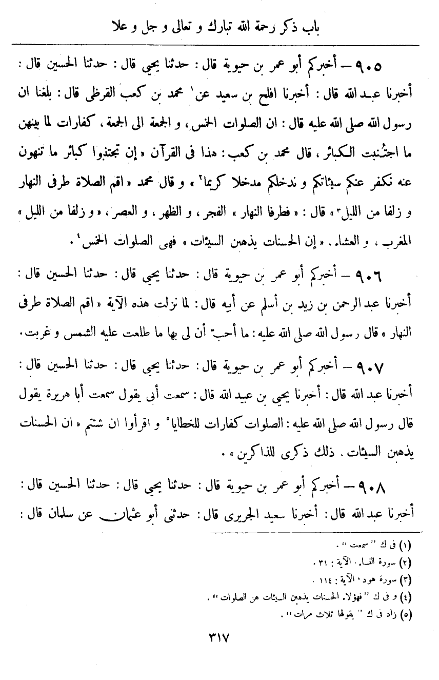 ٩٠٨ - أَخْبَرَكُمْ أَبُو عُمَرَ بْنُ حَيَوَيْهِ قَالَ: حَدَّثَنَا يَحْيَى قَالَ: حَدَّثَنَا الْحُسَيْنُ قَالَ: أَخْبَرَنَا عَبْدُ اللَّهِ قَالَ: أَخْبَرَنَا سَعِيدٌ الْجُرَيْرِيُّ قَالَ: حَدَّثَنِي أَبُو عُثْمَانَ، عَنْ سَلْمَانَ قَالَ ⦗٣١٨⦘: «وَالَّذِي نَفْسِي بِيَدِهِ، إِنَّ الْحَسَنَاتِ اللَّاتِي يَمْحُو اللَّهُ بِهِنَّ السَّيِّئَاتِ كَمَا يَغْسِلُ الْمَاءُ الدَّرَنَ، الصَّلَوَاتُ الْخَمْسُ»