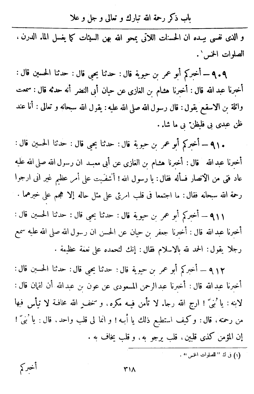 ٩١٠ - أَخْبَرَكُمْ أَبُو عُمَرَ بْنُ حَيَوَيْهِ قَالَ: حَدَّثَنَا يَحْيَى قَالَ: حَدَّثَنَا الْحُسَيْنُ قَالَ: أَخْبَرَنَا عَبْدُ اللَّهِ قَالَ: أَخْبَرَنَا هِشَامُ بْنُ الْغَازِي، عَنْ أَبِي مَعْبَدٍ أَنَّ رَسُولَ اللَّهِ صَلَّى اللهُ عَلَيْهِ وَسَلَّمَ: عَادَ فَتًى مِنَ الْأَنْصَارِ، فَسَأَلَهُ، فَقَالَ: يَا رَسُولَ اللَّهِ، أَشْفَيْتُ عَلَى أَمْرٍ عَظِيمٍ، غَيْرَ أَنِّي أَرْجُو رَحْمَةَ اللَّهِ سُبْحَانَهُ، فَقَالَ: «مَا اجْتَمَعَا فِي قَلْبِ امْرِئٍ عَلَى مِثْلِ حَالِهِ، إِلَّا هَجَمَ عَلَى خَيْرِهِمَا»