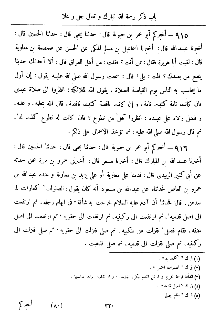 ٩١٦ - أَخْبَرَكُمْ أَبُو عُمَرَ بْنُ حَيَوَيْهِ قَالَ: حَدَّثَنَا يَحْيَى قَالَ: حَدَّثَنَا الْحُسَيْنُ قَالَ: أَخْبَرَنَا عَبْدُ اللَّهِ قَالَ: أَخْبَرَنَا مِسْعَرٌ قَالَ: أَخْبَرَنِي عَمْرُو بْنُ مُرَّةَ، عَمَّنْ حَدَّثَهُ، عَنْ أَبِي كَثِيرٍ الزُّبَيْدِيِّ قَالَ: قَدِمْنَا عَلَى مُعَاوِيَةَ، أَوْ عَلَى يَزِيدَ بْنِ مُعَاوِيَةَ، وَعِنْدَهُ عَبْدُ اللَّهِ بْنُ عَمْرِو بْنِ الْعَاصِ، فَحَدَّثَنَاهُ عَنْ عَبْدِ اللَّهِ بْنِ مَسْعُودٍ أَنَّهُ كَانَ يَقُولُ: «الصَّلَوَاتُ كَفَّارَاتٌ لِمَا بَعْدَهُنَّ» ، قَالَ: فَحَدَّثَنَا «أَنَّ آدَمَ عَلَيْهِ السَّلَامُ خَرَجَتْ بِهِ شَأْفَةٌ فِي إِبْهَامِ رِجْلِهِ، ثُمَّ ارْتَفَعَتْ إِلَى أَصْلِ قَدَمَيْهِ، ثُمَّ ارْتَفَعَتْ إِلَى رُكْبَتَيْهِ، ثُمَّ ارْتَفَعَتْ إِلَى حِقْوَيْهِ، ثُمَّ ارْتَفَعَتْ إِلَى أَصْلِ عُنُقِهِ، فَقَامَ فَصَلَّى فَنَزَلَتْ عَنْ مَنْكِبَيْهِ، ثُمَّ صَلَّى فَنَزَلَتْ إِلَى حِقْوَيْهِ، ثُمَّ صَلَّى فَنَزَلَتْ إِلَى رُكْبَتَيْهِ، ثُمَّ صَلَّى فَنَزَلَتْ إِلَى قَدَمَيْهِ، ثُمَّ صَلَّى فَذَهَبَتْ»