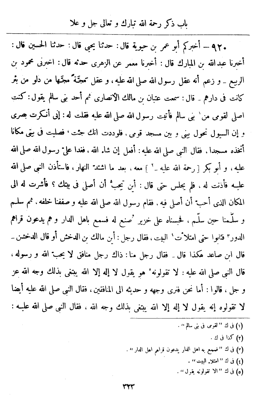 ٩٢٠ - أَخْبَرَكُمْ أَبُو عُمَرَ بْنُ حَيَوَيْهِ قَالَ: حَدَّثَنَا يَحْيَى قَالَ: حَدَّثَنَا الْحُسَيْنُ قَالَ: أَخْبَرَنَا عَبْدُ اللَّهِ بْنُ الْمُبَارَكِ قَالَ: أَخْبَرَنَا مَعْمَرٌ، عَنِ الزُّهْرِيِّ، حَدَّثَهُ قَالَ: أَخْبَرَنِي مَحْمُودُ بْنُ الرَّبِيعِ، وَزَعَمَ أَنَّهُ عَقَلَ رَسُولَ اللَّهِ صَلَّى اللهُ عَلَيْهِ وَسَلَّمَ، وَعَقَلَ مَجَّةً مَجَّهَا مِنْ دَلْوٍ مِنْ بِئْرٍ كَانَتْ فِي دَارِهِمْ، قَالَ: سَمِعْتُ عِتْبَانَ بْنَ مَالِكٍ الْأَنْصَارِيَّ، ثُمَّ أَحَدَ بَنِي سَالِمٍ يَقُولُ: كُنْتُ أُصَلِّي لِقَوْمِي مِنْ بَنِي سَالِمٍ، فَأَتَيْتُ رَسُولَ اللَّهِ صَلَّى اللهُ عَلَيْهِ وَسَلَّمَ، فَقُلْتُ لَهُ: إِنِّي أَنْكَرْتُ بَصَرِي، وَإِنَّ السُّيُولَ تَحُولُ بَيْنِي وَبَيْنَ مَسْجِدِ قَوْمِي، فَلَوَدِدْتُ أَنَّكَ جِئْتَ فَصَلَّيْتَ فِي بَيْتِي مَكَانًا أَتَّخِذُهُ مَسْجِدًا، فَقَالَ النَّبِيُّ صَلَّى اللهُ عَلَيْهِ وَسَلَّمَ: «أَفْعَلُ إِنْ شَاءَ اللَّهُ» ، فَغَدَا عَلَيَّ رَسُولُ اللَّهِ صَلَّى اللهُ عَلَيْهِ وَسَلَّمَ وَأَبُو بَكْرٍ رَحْمَةُ اللَّهِ عَلَيْهِمْ مَعَهُ، بَعْدَ مَا اشْتَدَّ النَّهَارُ، فَاسْتَأْذَنَ النَّبِيُّ صَلَّى اللهُ عَلَيْهِ وَسَلَّمَ، فَأَذِنْتُ لَهُ، فَلَمْ يَجْلِسْ حَتَّى قَالَ: «أَيْنَ تُحِبُّ أَنْ أُصَلِّيَ فِي بَيْتِكَ؟» فَأَشَرْتُ لَهُ إِلَى الْمَكَانِ الَّذِي أُحِبُّ أَنْ أُصَلِّيَ فِيهِ، فَقَامَ رَسُولُ اللَّهِ صَلَّى اللهُ عَلَيْهِ وَسَلَّمَ، وَصَفَّنَا خَلْفَهُ، ثُمَّ جَلَسَ وَسَلَّمْنَا حِينَ سَلَّمَ، فَحَبَسْنَاهُ عَلَى خَزِيرٍ صُنِعَ لَهُ، فَسَمِعَ بِهِ أَهْلُ الدَّارِ، وَهُمْ يَدْعُونَ قِرَاهُمُ الدُّورَ، فَثَابُوا حَتَّى امْتَلَأَ الْبَيْتُ، فَقَالَ رَجُلٌ: أَيْنَ مَالِكُ بْنُ الدُّخْشُنِ - أَوْ قَالَ: الدُّخْشُنِ؟ قَالَ ابْنُ صَاعِدٍ: هَكَذَا قَالَ - فَقَالَ رَجُلٌ مِنَّا: ذَاكَ رَجُلٌ مُنَافِقٌ لَا يُحِبُّ اللَّهَ وَرَسُولَهُ، قَالَ النَّبِيُّ صَلَّى اللهُ عَلَيْهِ وَسَلَّمَ: «لَا تَقُولُوهُ , وَهُوَ يَقُولُ لَا إِلَهَ إِلَّا اللَّهُ يَبْتَغِي بِذَلِكَ وَجْهَ اللَّهِ عَزَّ وَجَلَّ» قَالُوا: أَمَّا نَحْنُ فَنَرَى وَجْهَهُ وَحَدِيثَهُ إِلَى الْمُنَافِقِينَ، فَقَالَ النَّبِيُّ صَلَّى اللهُ عَلَيْهِ وَسَلَّمَ أَيْضًا: " لَا تَقُولُوهُ، إِنَّهُ يَقُولُ: لَا إِلَهَ إِلَّا اللَّهُ يَبْتَغِي بِذَلِكَ وَجْهَ اللَّهِ "، فَقَالَ النَّبِيُّ صَلَّى اللهُ عَلَيْهِ وَسَلَّمَ ⦗٣٢٤⦘: " لَنْ يُوَافِيَ عَبْدٌ يَوْمَ الْقِيَامَةِ، وَهُوَ يَقُولُ: لَا إِلَهَ إِلَّا اللَّهُ يَبْتَغِي بِذَلِكَ وَجْهَ اللَّهِ إِلَّا حَرَّمَ اللَّهُ عَلَيْهِ النَّارَ "، قَالَ مَحْمُودٌ: فَحَدَّثْتُ قَوْمًا فِيهِمْ أَبُو أَيُّوبَ صَاحِبُ النَّبِيِّ صَلَّى اللهُ عَلَيْهِ وَسَلَّمَ فِي غَزْوَتِهِ الَّتِي تُوُفِّيَ فِيهَا مَعَ يَزِيدَ بْنِ مُعَاوِيَةَ، فَأَنْكَرَ ذَلِكَ عَلَيَّ، وَقَالَ: مَا أَظُنُّ رَسُولَ اللَّهِ صَلَّى اللهُ عَلَيْهِ وَسَلَّمَ قَالَ مَا قُلْتَ قَطُّ فَكَبُرَ ذَلِكَ عَلَيَّ، فَجَعَلْتُ لِلَّهِ عَلَيَّ إِنْ سَلَّمَنِي اللَّهُ تَعَالَى حَتَّى أَقْفُلَ مِنْ غَزْوَتِي أَنْ أَسْأَلَ عَنْهَا عِتْبَانَ بْنَ مَالِكٍ، إِنْ وَجَدْتُهُ حَيًّا، فَأَهْلَلْتُ مِنْ إِيلِيَاءَ بِحَجٍّ أَوْ عُمْرَةٍ حَتَّى قَدِمْتُ الْمَدِينَةَ، فَأَتَيْتُ بَنِي سَالِمٍ، فَإِذَا عِتْبَانُ بْنُ مَالِكٍ شَيْخٌ كَبِيرٌ قَدْ ذَهَبَ بَصَرُهُ، وَهُوَ إِمَامُ قَوْمِهِ، فَلَمَّا سَلَّمَ مِنْ صَلَاتِهِ جِئْتُهُ، فَسَلَّمْتُ عَلَيْهِ، ثُمَّ أَخْبَرْتُهُ مَنْ أَنَا، فَحَدَّثَنِي بِهِ كَمَا حَدَّثَنِي بِهِ أَوَّلَ مَرَّةٍ، قَالَ الزُّهْرِيُّ: «وَلَكِنَّا لَا نَدْرِي، أَكَانَ هَذَ