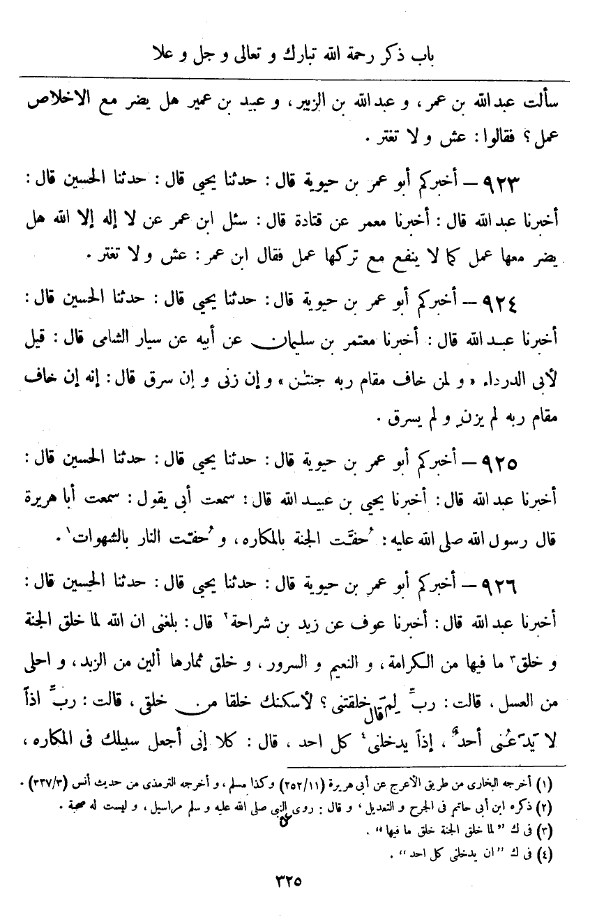 ٩٢٥ - أَخْبَرَكُمْ أَبُو عُمَرَ بْنُ حَيَوَيْهِ قَالَ: حَدَّثَنَا يَحْيَى قَالَ: حَدَّثَنَا الْحُسَيْنُ قَالَ: أَخْبَرَنَا عَبْدُ اللَّهِ قَالَ: أَخْبَرَنَا يَحْيَى بْنُ عُبَيْدِ اللَّهِ قَالَ: سَمِعْتُ أَبِي يَقُولُ: سَمِعْتُ أَبَا هُرَيْرَةَ قَالَ رَسُولُ اللَّهِ صَلَّى اللهُ عَلَيْهِ وَسَلَّمَ: «حُفَّتِ الْجَنَّةُ بِالْمَكَارِهِ، وَحُفَّتِ النَّارُ بِالشَّهَوَاتِ»