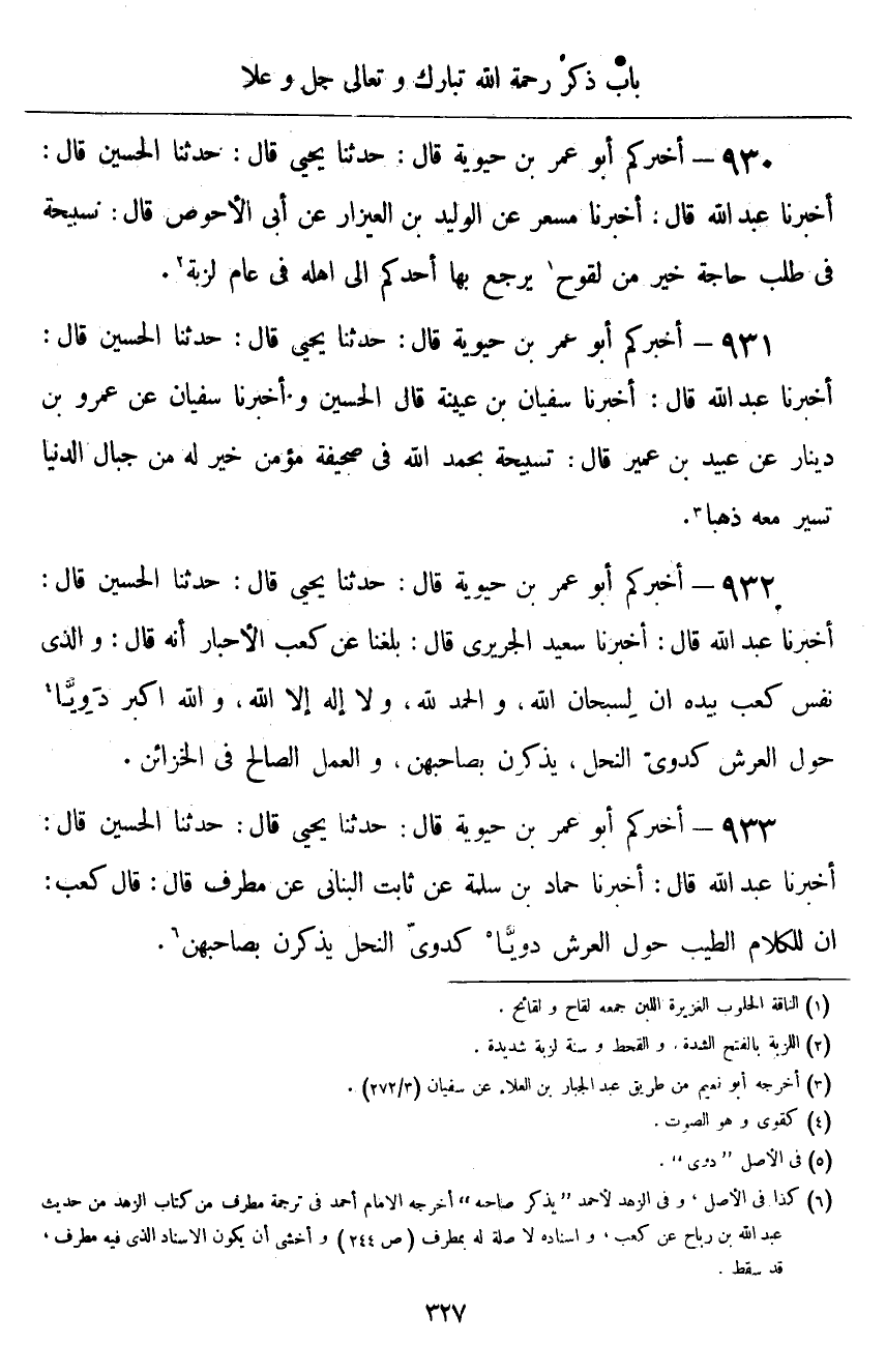 ٩٣٣ - أَخْبَرَكُمْ أَبُو عُمَرَ بْنُ حَيَوَيْهِ قَالَ: حَدَّثَنَا يَحْيَى قَالَ: حَدَّثَنَا الْحُسَيْنُ قَالَ: أَخْبَرَنَا عَبْدُ اللَّهِ قَالَ: أَخْبَرَنَا حَمَّادُ بْنُ سَلَمَةَ، عَنْ ثَابِتٍ الْبُنَانِيِّ، عَنْ مُطَرِّفٍ قَالَ: قَالَ كَعْبٌ: «إِنَّ لِلْكَلَامِ الطَّيِّبِ حَوْلَ الْعَرْشِ دَوِيًّا كَدَوِيِّ النَّحْلِ، يُذَكِّرْنَ بِصَاحِبِهِنَّ»