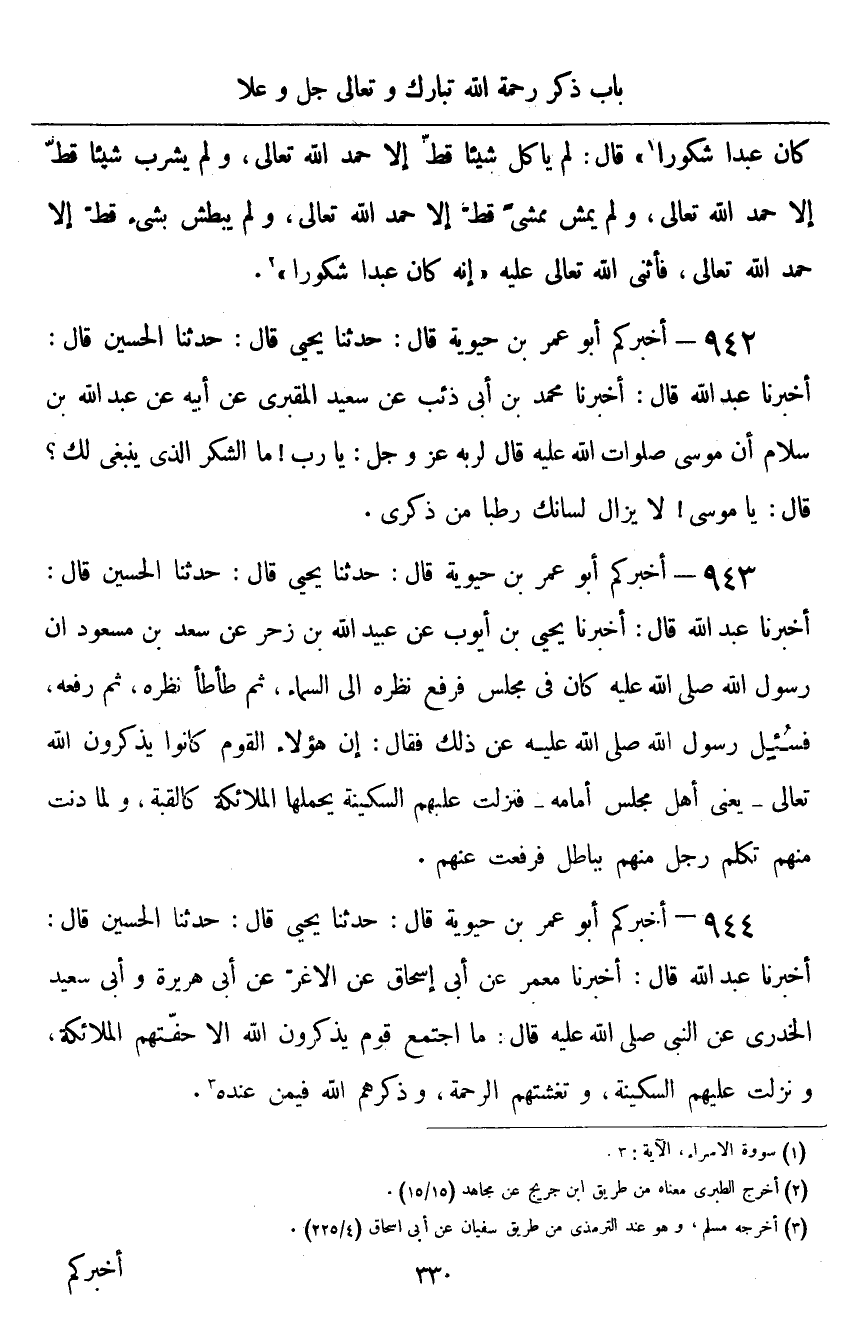 ٩٤٢ - أَخْبَرَكُمْ أَبُو عُمَرَ بْنُ حَيَوَيْهِ قَالَ: حَدَّثَنَا يَحْيَى قَالَ: حَدَّثَنَا الْحُسَيْنُ قَالَ: أَخْبَرَنَا عَبْدُ اللَّهِ قَالَ: أَخْبَرَنَا مُحَمَّدُ بْنُ أَبِي ذِئْبٍ، عَنْ سَعِيدٍ الْمَقْبُرِيِّ، عَنْ أَبِيهِ، عَنْ عَبْدِ اللَّهِ بْنِ سَلَامٍ " أَنَّ مُوسَى صَلَوَاتُ اللَّهِ عَلَيْهِ قَالَ لِرَبِّهِ عَزَّ وَجَلَّ: يَا رَبِّ، مَا الشُّكْرُ الَّذِي يَنْبَغِي لَكَ؟ قَالَ: يَا مُوسَى، لَا يَزَالُ لِسَانُكَ رَطْبًا مِنْ ذِكْرِي "