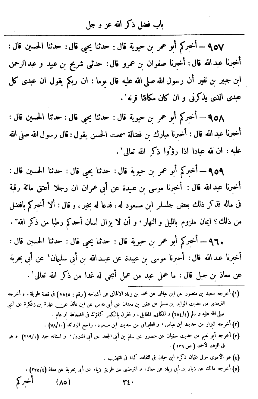 ٩٦٠ - أَخْبَرَكُمْ أَبُو عُمَرَ بْنُ حَيَوَيْهِ قَالَ: حَدَّثَنَا يَحْيَى قَالَ: حَدَّثَنَا الْحُسَيْنُ قَالَ: أَخْبَرَنَا عَبْدُ اللَّهِ قَالَ: أَخْبَرَنَا مُوسَى بْنُ عُبَيْدَةَ، عَنْ عَبْدِ اللَّهِ بْنِ أَبِي سُلَيْمَانَ، عَنْ أَبِي بَحْرِيَّةَ، عَنْ مُعَاذِ بْنِ جَبَلٍ قَالَ: «مَا عَمِلَ عَبْدٌ مِنْ عَمَلٍ أَنْجَى لَهُ غَدًا مِنْ ذِكْرِ اللَّهِ تَعَالَى»
