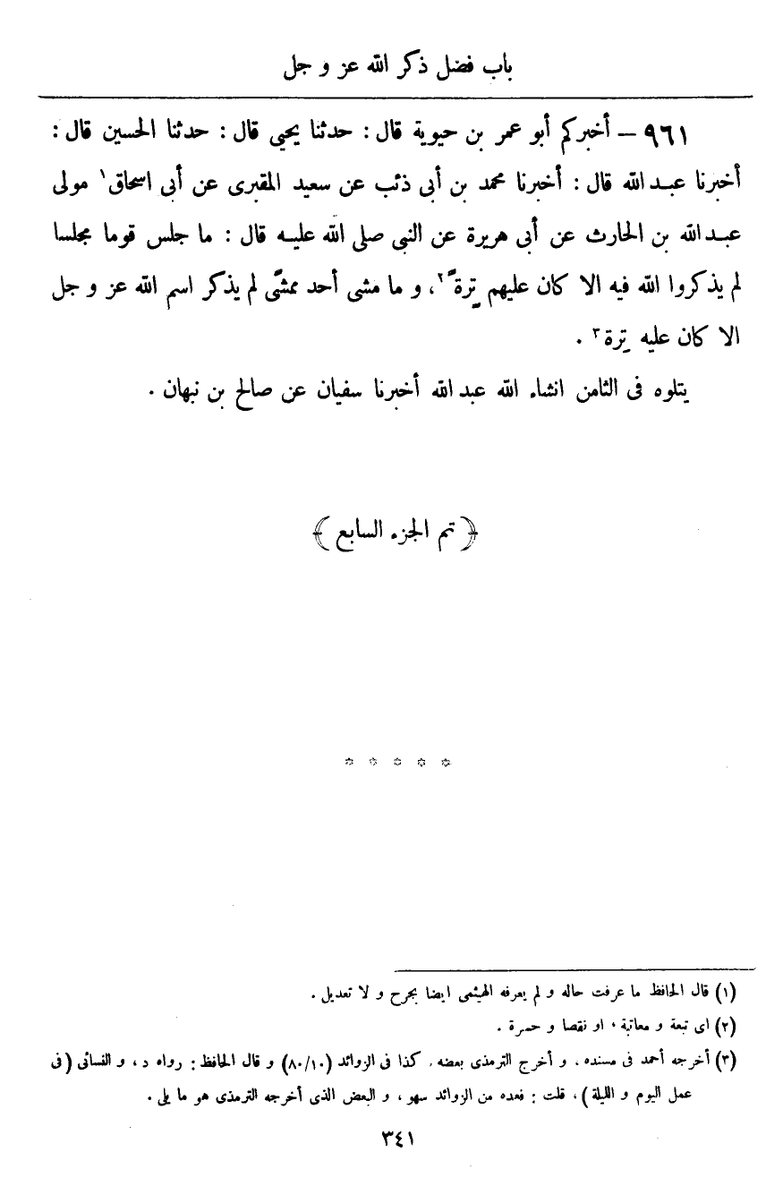 ٩٦١ - أَخْبَرَكُمْ أَبُو عُمَرَ بْنُ حَيَوَيْهِ قَالَ: حَدَّثَنَا يَحْيَى قَالَ: حَدَّثَنَا الْحُسَيْنُ قَالَ: أَخْبَرَنَا عَبْدُ اللَّهِ قَالَ: أَخْبَرَنَا مُحَمَّدُ بْنُ أَبِي ذِئْبٍ، عَنْ سَعِيدٍ الْمَقْبُرِيِّ، عَنْ أَبِي إِسْحَاقَ مَوْلَى عَبْدِ اللَّهِ بْنِ الْحَارِثِ، عَنْ أَبِي هُرَيْرَةَ، عَنِ النَّبِيِّ صَلَّى اللهُ عَلَيْهِ وَسَلَّمَ قَالَ: «مَا جَلَسَ قَوْمٌ مَجْلِسًا لَمْ يَذْكُرُوا اللَّهَ فِيهِ، إِلَّا كَانَ عَلَيْهِمْ تِرَةً، وَمَا مَشَى أَحَدٌ مَمْشًى لَمْ يَذْكُرِ اسْمَ اللَّهِ عَزَّ وَجَلَّ إِلَّا كَانَ عَلَيْهِ تِرَةً»