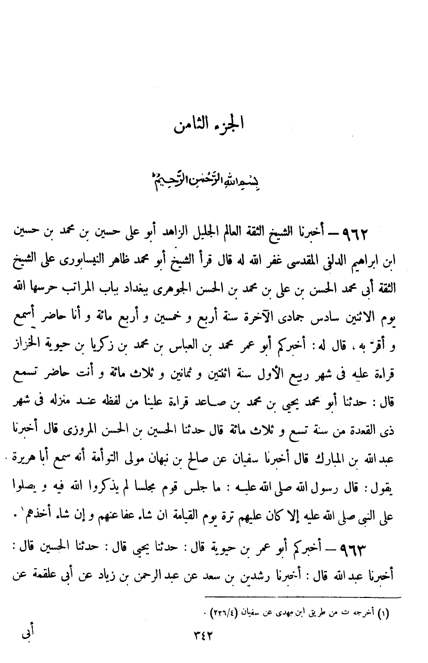 ٩٦٢ - أَخْبَرَنَا الشَّيْخُ الثِّقَةُ الْعَالِمُ الْجَلِيلُ الزَّاهِدُ أَبُو عَلِيٍّ الْحُسَيْنُ بْنُ مُحَمَّدِ بْنِ الْحُسَيْنِ بْنِ إِبْرَاهِيمَ الدُّلَفِيُّ الْمَقْدِسِيُّ غَفَرَ اللَّهُ لَهُ، قَرَأَ الشَّيْخُ أَبُو مُحَمَّدٍ ظَاهِرٌ النَّيْسَابُورِيُّ، عَلَى الشَّيْخِ الثِّقَةِ أَبِي مُحَمَّدٍ الْحَسَنِ بْنِ عَلِيِّ بْنِ مُحَمَّدِ بْنِ الْحَسَنِ الْجَوْهَرِيِّ بِبَغْدَادَ بِبَابِ الْمَرَاتِبِ حَرَسَهَا اللَّهُ يَوْمَ الْإِثْنَيْنِ سَادِسِ جُمَادَى الْآخِرَةِ سَنَةَ أَرْبَعٍ وَخَمْسِينَ وَأَرْبَعِمِائَةٍ وَأَنَا حَاضِرٌ أَسْمَعُ، وَأَقَرَّ بِهِ، قَالَ لَهُ: أَخْبَرَكُمْ أَبُو عُمَرَ مُحَمَّدُ بْنُ الْعَبَّاسِ بْنِ مُحَمَّدِ بْنِ زَكَرِيَّا بْنِ حَيَوَيْهِ الْخَزَّازُ قِرَاءَةً عَلَيْهِ فِي شَهْرِ رَبِيعٍ الْأَوَّلِ سَنَةَ اثْنَتَيْنِ وَثَمَانِينَ وَثَلَاثِمِائَةٍ وَأَنْتَ حَاضِرٌ تَسْمَعُ، قَالَ: حَدَّثَنَا أَبُو مُحَمَّدٍ يَحْيَى بْنُ مُحَمَّدِ بْنِ صَاعِدٍ قِرَاءَةً عَلَيْنَا مِنْ لَفْظِهِ عِنْدَ مَنْزِلِهِ فِي شَهْرِ ذِي الْقِعْدَةِ مِنْ سَنَةِ تِسْعٍ وَثَلَاثِمِائَةٍ قَالَ: حَدَّثَنَا الْحُسَيْنُ بْنُ الْحَسَنِ الْمَرْوَزِيُّ قَالَ: أَخْبَرَنَا عَبْدُ اللَّهِ بْنُ الْمُبَارَكِ قَالَ: أَخْبَرَنَا سُفْيَانُ، عَنْ صَالِحِ بْنِ نَبْهَانَ مَوْلَى التَّوْأَمَةِ أَنَّهُ سَمِعَ أَبَا هُرَيْرَةَ يَقُولُ: قَالَ رَسُولُ اللَّهِ صَلَّى اللهُ عَلَيْهِ وَسَلَّمَ: «مَا جَلَسَ قَوْمٌ مَجْلِسًا لَمْ يَذْكُرُوا اللَّهَ فِيهِ، وَيُصَلُّوا عَلَى النَّبِيِّ صَلَّى اللهُ عَلَيْهِ وَسَلَّمَ، إِلَّا كَانَ عَلَيْهِمْ تِرَةً يَوْمَ الْقِيَامَةِ، إِنْ شَاءَ عَفَا عَنْهُمْ، وَإِنْ شَاءَ أَخَذَهُمْ»