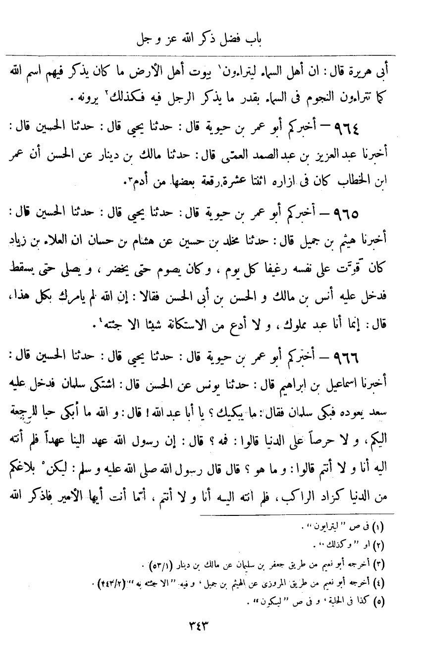 ٩٦٥ - أَخْبَرَكُمْ أَبُو عُمَرَ بْنُ حَيَوَيْهِ قَالَ: حَدَّثَنَا يَحْيَى قَالَ: حَدَّثَنَا الْحُسَيْنُ قَالَ: أَخْبَرَنَا هَيْثَمُ بْنُ جَمِيلٍ قَالَ: حَدَّثَنَا مَخْلَدُ بْنُ حُسَيْنٍ، عَنْ هِشَامِ بْنِ حَسَّانَ أَنَّ الْعَلَاءَ بْنَ زِيَادٍ كَانَ قَوَّتَ عَلَى نَفْسِهِ رَغِيفًا كُلَّ يَوْمٍ، وَكَانَ يَصُومُ حَتَّى يَخْضَرَّ، وَيُصَلِّي حَتَّى يَسْقُطَ، فَدَخَلَ عَلَيْهِ أَنَسُ بْنُ مَالِكٍ، وَالْحَسَنُ بْنُ أَبِي الْحَسَنِ فَقَالَا: «إِنَّ اللَّهَ لَمْ يَأْمُرْكَ بِكُلِّ هَذَا» ، قَالَ: إِنَّمَا أَنَا عَبْدٌ مَمْلُوكٌ، وَلَا أَدَعُ مِنَ الِاسْتِكَانَةِ شَيْئًا إِلَّا جِئْتُهُ "