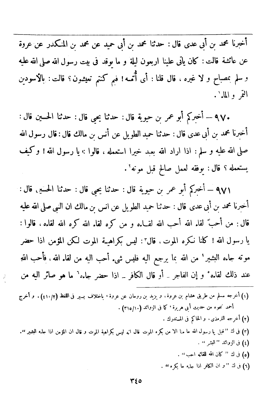 ٩٧١ - أَخْبَرَكُمْ أَبُو عُمَرَ بْنُ حَيَوَيْهِ قَالَ: حَدَّثَنَا يَحْيَى قَالَ: حَدَّثَنَا الْحُسَيْنُ قَالَ: أَخْبَرَنَا مُحَمَّدُ بْنُ أَبِي عَدِيٍّ قَالَ: حَدَّثَنَا حُمَيْدٌ الطَّوِيلُ، عَنْ أَنَسِ بْنِ مَالِكٍ أَنَّ النَّبِيَّ صَلَّى اللهُ عَلَيْهِ وَسَلَّمَ قَالَ: «مَنْ أَحَبَّ لِقَاءَ اللَّهِ أَحَبَّ اللَّهُ لِقَاءَهُ، وَمَنْ كَرِهَ لِقَاءَ اللَّهِ كَرِهَ اللَّهُ لِقَاءَهُ» ، قَالُوا: يَا رَسُولَ اللَّهِ، كُلُّنَا نَكْرَهُ الْمَوْتَ، قَالَ: " لَيْسَ بِكَرَاهِيَةِ الْمَوْتِ، لَكِنَّ الْمُؤْمِنَ إِذَا حَضَرَ مَوْتُهُ جَاءَهُ الْبَشِيرُ مِنَ اللَّهِ بِمَا يَرْجِعُ إِلَيْهِ، فَلَيْسَ شَيْءٌ أَحَبَّ إِلَيْهِ مِنْ لِقَاءِ اللَّهِ، فَأَحَبَّ عِنْدَ ذَلِكَ لِقَاءَهُ، وَإِنَّ الْفَاجِرَ - أَوْ قَالَ: الْكَافِرَ - إِذَا حُضِرَ جَاءَهُ مَا هُوَ صَائِرٌ إِلَيْهِ مِنَ ⦗٣٤٦⦘ الشَّرِّ، وَمَا يَلْقَى مِنَ الشَّرِّ؛ فَكَرِهَ لِقَاءَ اللَّهِ، وَكَرِهَ اللَّهُ لِقَاءَهُ "