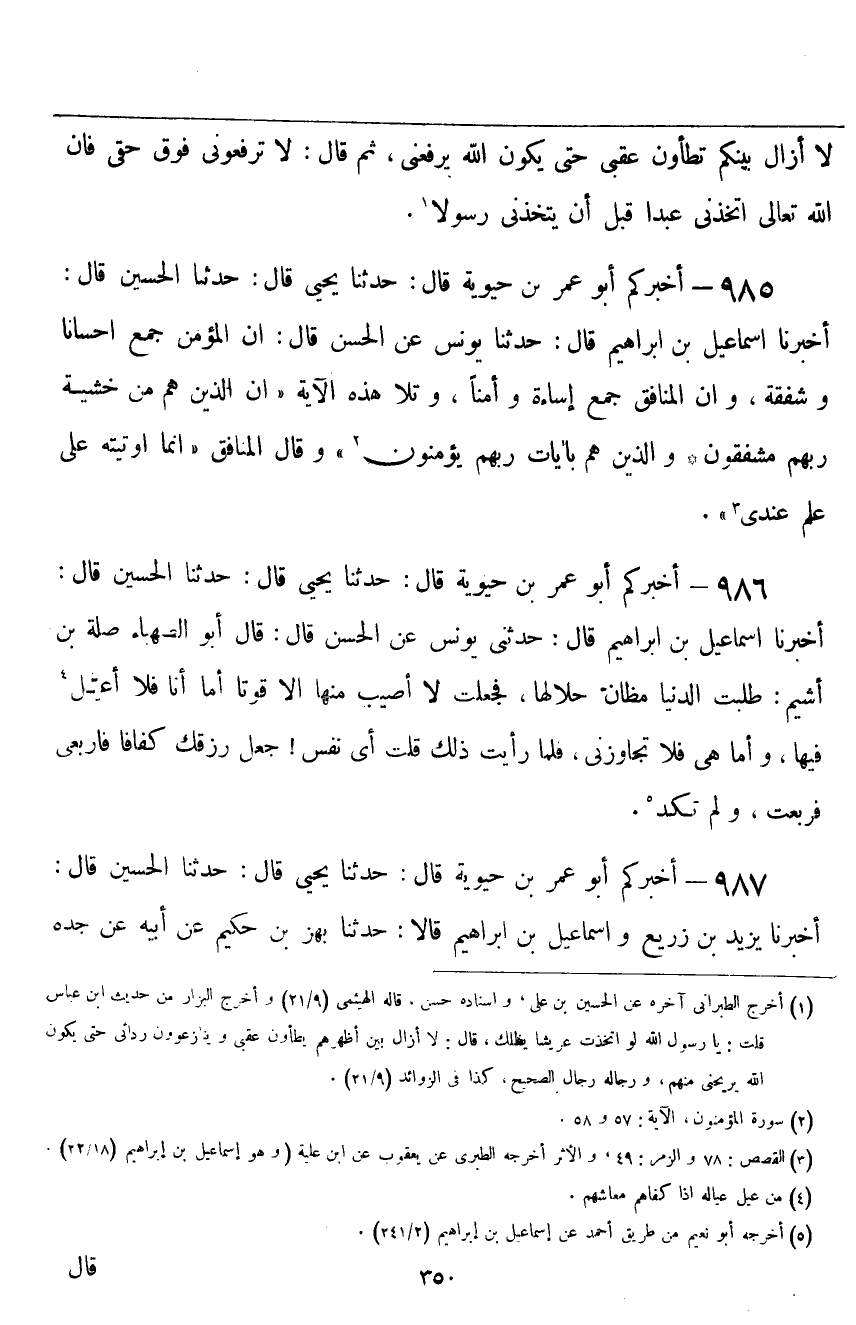 ٩٨٥ - أَخْبَرَكُمْ أَبُو عُمَرَ بْنُ حَيَوَيْهِ قَالَ: حَدَّثَنَا يَحْيَى قَالَ: حَدَّثَنَا الْحُسَيْنُ قَالَ: أَخْبَرَنَا إِسْمَاعِيلُ بْنُ إِبْرَاهِيمَ قَالَ: حَدَّثَنَا يُونُسُ، عَنِ الْحَسَنِ قَالَ: «إِنَّ الْمُؤْمِنَ جَمَعَ إِحْسَانًا وَشَفَقَةً، وَإِنَّ الْمُنَافِقَ جَمَعَ إِسَاءَةً وَأَمْنًا» ، وَتَلَا هَذِهِ الْآيَةَ: {إِنَّ الَّذِينَ هُمْ مِنْ خَشْيَةِ رَبِّهِمْ مُشْفِقُونَ وَالَّذِينَ هُمْ بِآيَاتِ رَبِّهِمْ يُؤْمِنُونَ} [المؤمنون: ٥٨] وَقَالَ الْمُنَافِقُ: {إِنَّمَا أُوتِيتُهُ عَلَى عِلْمٍ عِنْدِي} [القصص: ٧٨] "
