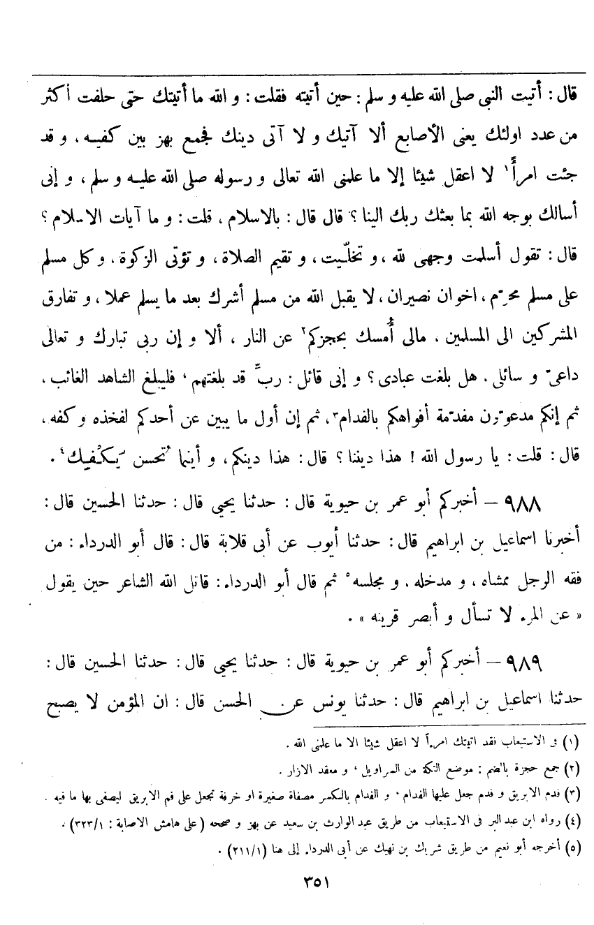 ٩٨٨ - أَخْبَرَكُمْ أَبُو عُمَرَ بْنُ حَيَوَيْهِ قَالَ: حَدَّثَنَا يَحْيَى قَالَ: حَدَّثَنَا الْحُسَيْنُ قَالَ: أَخْبَرَنَا إِسْمَاعِيلُ بْنُ إِبْرَاهِيمَ قَالَ: حَدَّثَنَا أَيُّوبُ، عَنْ أَبِي قِلَابَةَ قَالَ: قَالَ أَبُو الدَّرْدَاءِ: «مِنْ فِقْهِ الرَّجُلِ مَمْشَاهُ، وَمَدْخَلُهُ، وَمَجْلِسُهُ»