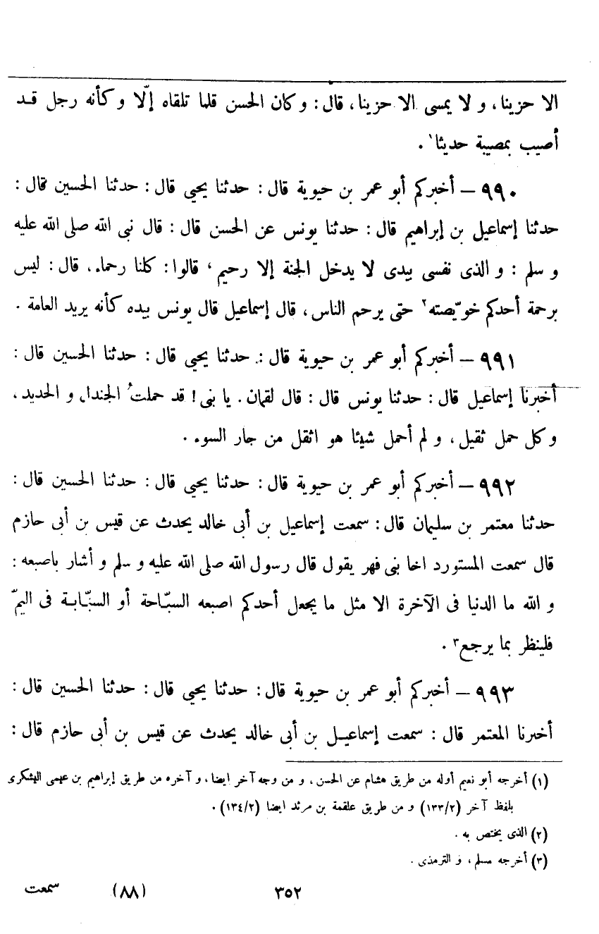 ٩٩٠ - أَخْبَرَكُمْ أَبُو عُمَرَ بْنُ حَيَوَيْهِ قَالَ: حَدَّثَنَا يَحْيَى قَالَ: حَدَّثَنَا الْحُسَيْنُ قَالَ: حَدَّثَنَا إِسْمَاعِيلُ بْنُ إِبْرَاهِيمَ قَالَ: حَدَّثَنَا يُونُسُ، عَنِ الْحَسَنِ قَالَ: قَالَ نَبِيُّ اللَّهِ صَلَّى اللهُ عَلَيْهِ وَسَلَّمَ: «وَالَّذِي نَفْسِي بِيَدِهِ، لَا يَدْخُلُ الْجَنَّةَ إِلَّا رَحِيمٌ» ، قَالُوا: كُلُّنَا رُحَمَاءُ، قَالَ: «لَيْسَ بِرَحْمَةِ أَحَدِكُمْ خُوَيِّصَتَهُ حَتَّى يَرْحَمَ النَّاسَ» ، قَالَ إِسْمَاعِيلُ: قَالَ يُونُسُ بِيَدِهِ كَأَنَّهُ يُرِيدُ الْعَامَّةَ