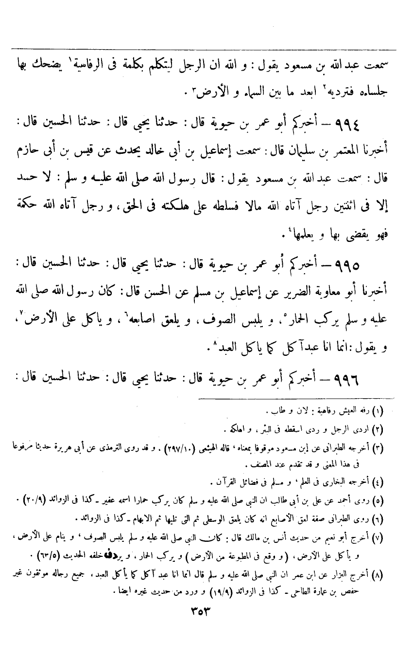 ٩٩٤ - أَخْبَرَكُمْ أَبُو عُمَرَ بْنُ حَيَوَيْهِ قَالَ: حَدَّثَنَا يَحْيَى قَالَ: حَدَّثَنَا الْحُسَيْنُ قَالَ: أَخْبَرَنَا الْمُعْتَمِرُ بْنُ سُلَيْمَانَ قَالَ: سَمِعْتُ إِسْمَاعِيلَ بْنَ أَبِي خَالِدٍ يُحَدِّثُ عَنْ قَيْسِ بْنِ أَبِي حَازِمٍ قَالَ: سَمِعْتُ عَبْدَ اللَّهِ بْنَ مَسْعُودٍ يَقُولُ: قَالَ رَسُولُ اللَّهِ صَلَّى اللهُ عَلَيْهِ وَسَلَّمَ: " لَا حَسَدَ إِلَّا فِي اثْنَتَيْنِ: رَجُلٌ آتَاهُ اللَّهُ مَالًا فَسَلَّطَهُ عَلَى هَلَكَتِهِ فِي الْحَقِّ، وَرَجُلٌ آتَاهُ اللَّهُ حِكْمَةً فَهُوَ يَقْضِي بِهَا، وَيُعَلِّمُهَا "