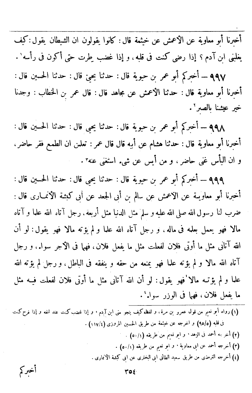 ٩٩٩ - أَخْبَرَكُمْ أَبُو عُمَرَ بْنُ حَيَوَيْهِ قَالَ: حَدَّثَنَا يَحْيَى قَالَ: حَدَّثَنَا الْحُسَيْنُ قَالَ: أَخْبَرَنَا أَبُو مُعَاوِيَةَ، عَنِ الْأَعْمَشِ، عَنْ سَالِمِ بْنِ أَبِي الْجَعْدِ، عَنْ أَبِي كَبْشَةَ الْأَنْمَارِيِّ قَالَ: " ضَرَبَ لَنَا رَسُولُ اللَّهِ صَلَّى اللهُ عَلَيْهِ وَسَلَّمَ مَثَلَ الدُّنْيَا مَثَلَ أَرْبَعَةٍ: رَجُلٌ آتَاهُ اللَّهُ عِلْمًا، وَآتَاهُ مَالًا، فَهُوَ يَعْمَلُ بِعِلْمِهِ فِي مَالِهِ، وَرَجُلٌ آتَاهُ اللَّهُ عِلْمًا، وَلَمْ يُؤْتِهِ مَالًا فَهُوَ يَقُولُ: لَوْ أَنَّ اللَّهَ آتَانِي مِثْلَ مَا أُوتِيَ فُلَانٌ؛ لَفَعَلْتُ مِثْلَ مَا يَفْعَلُ فُلَانٌ، فَهُمَا فِي الْأَجْرِ سَوَاءٌ، وَرَجُلٌ آتَاهُ اللَّهُ مَالًا، وَلَمْ يُؤْتِهِ عِلْمًا، فَهُوَ يَمْنَعُهُ مِنْ حَقِّهِ، وَيُنْفِقُهُ فِي الْبَاطِلِ، وَرَجُلٌ لَمْ يُؤْتِهِ اللَّهُ عِلْمًا، وَلَمْ يُؤْتِهِ مَالًا فَهُوَ يَقُولُ: لَوْ أَنَّ اللَّهَ آتَانِي مِثْلَ مَا أُوتِيَ فُلَانٌ، لَفَعَلْتُ فِيهِ مِثْلَ مَا يَفْعَلُ فُلَانٌ، فَهُمَا فِي الْوِزْرِ سَوَاءٌ "