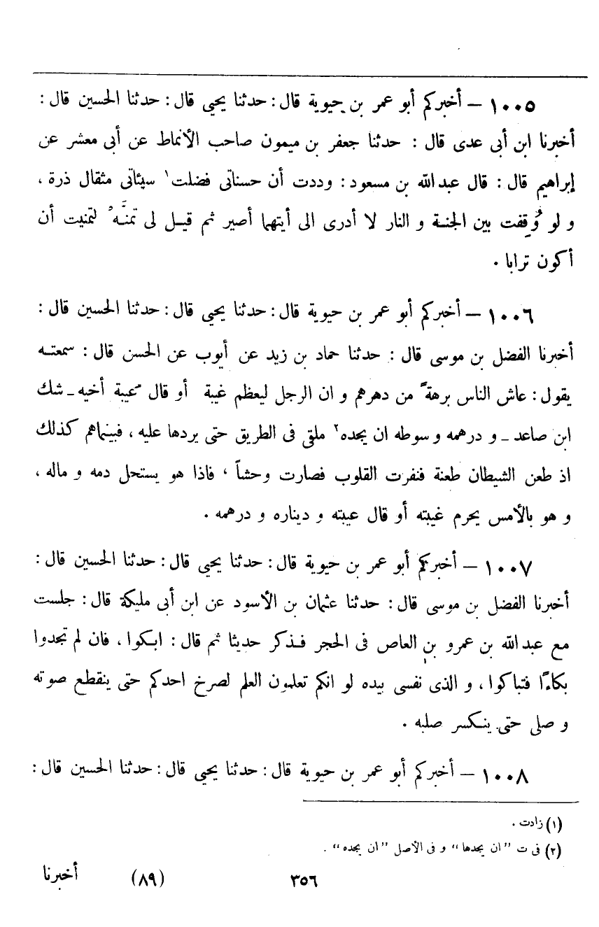 ١٠٠٥ - أَخْبَرَكُمْ أَبُو عُمَرَ بْنُ حَيَوَيْهِ قَالَ: حَدَّثَنَا يَحْيَى قَالَ: حَدَّثَنَا الْحُسَيْنُ قَالَ: أَخْبَرَنَا ابْنُ أَبِي عَدِيٍّ قَالَ: حَدَّثَنَا جَعْفَرُ بْنُ مَيْمُونٍ صَاحِبُ الْأَنْمَاطِ، عَنْ أَبِي مَعْشَرٍ، عَنْ إِبْرَاهِيمَ قَالَ: قَالَ عَبْدُ اللَّهِ بْنُ مَسْعُودٍ: «وَدِدْتُ أَنَّ حَسَنَاتِي فَضُلَتْ سَيِّئَاتِي مِثْقَالَ ذَرَّةٍ، وَلَوْ وُقِفْتُ بَيْنَ الْجَنَّةِ وَالنَّارِ لَا أَدْرِي إِلَى أَيَّتِهِمَا أَصِيرُ، ثُمَّ قِيلَ لِي تَمَنَّهْ لَتَمَنَّيْتُ أَنْ أَكُونَ تُرَابًا»