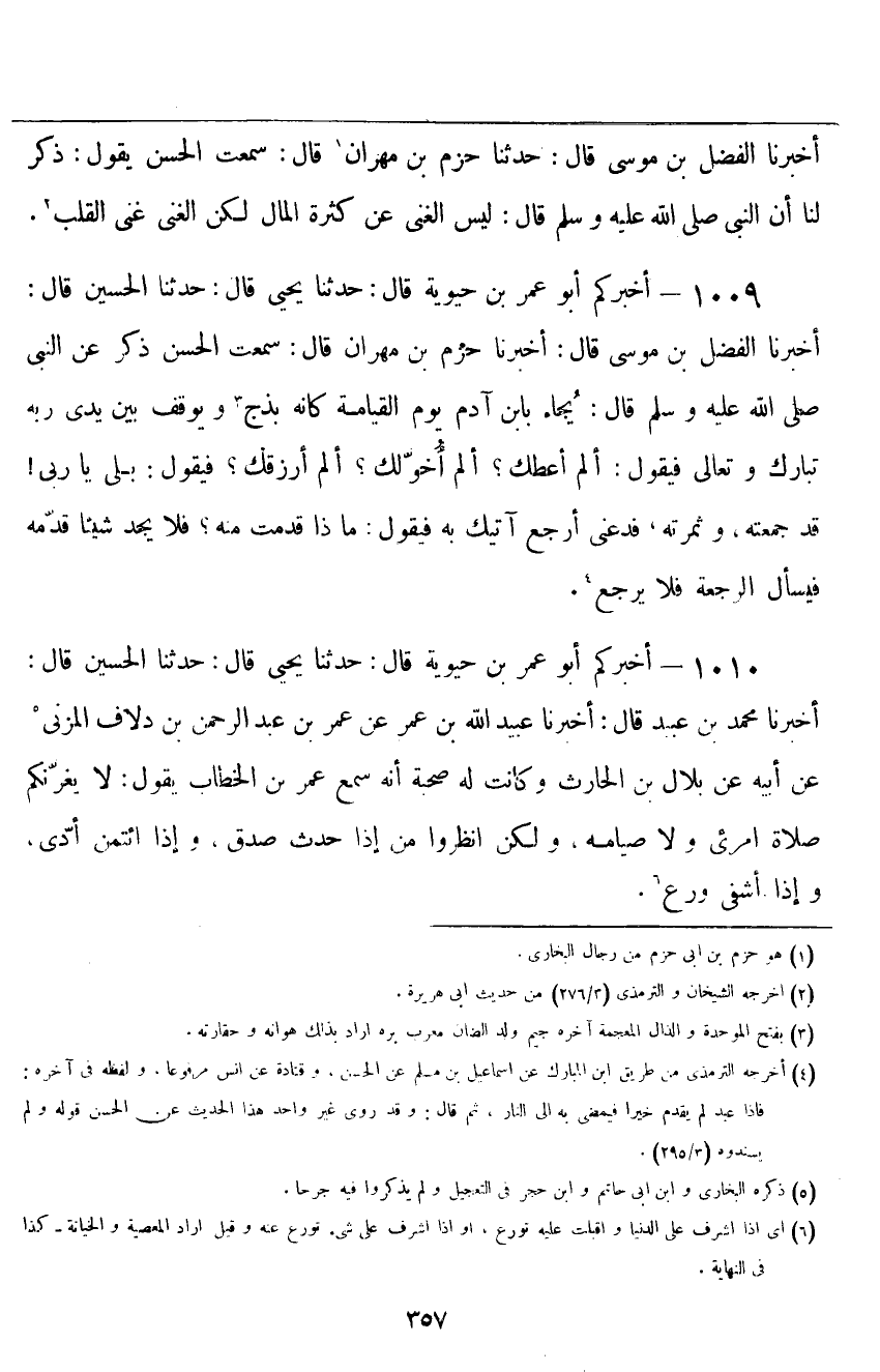 ١٠٠٩ - أَخْبَرَكُمْ أَبُو عُمَرَ بْنُ حَيَوَيْهِ قَالَ: حَدَّثَنَا يَحْيَى قَالَ: حَدَّثَنَا الْحُسَيْنُ قَالَ: أَخْبَرَنَا الْفَضْلُ بْنُ مُوسَى قَالَ: أَخْبَرَنَا حَزْمُ بْنُ مِهْرَانَ قَالَ: سَمِعْتُ الْحَسَنَ، ذَكَرَ عَنِ النَّبِيِّ صَلَّى اللهُ عَلَيْهِ وَسَلَّمَ قَالَ: " يُجَاءُ بِابْنِ آدَمَ يَوْمَ الْقِيَامَةِ كَأَنَّهُ بَذَجٌ، وَيُوقَفُ بَيْنَ يَدَيْ رَبِّهِ تَبَارَكَ وَتَعَالَى، فَيَقُولُ: أَلَمْ أُعْطِكَ؟ أَلَمْ أُخَوِّلْكَ؟ أَلَمْ أَرْزُقْكَ؟ فَيَقُولُ: بَلَى يَا رَبِّي، قَدْ جَمَعْتُهُ، وَثَمَّرْتُهُ، فَدَعْنِي أَرْجِعْ آتِكَ بِهِ، فَيَقُولُ: مَاذَا قَدَّمْتَ مِنْهُ؟ فَلَا يَجِدُ شَيْئًا قَدَّمَهُ، فَيَسْأَلُ الرَّجْعَةَ , فَلَا يَرْجِعُ "