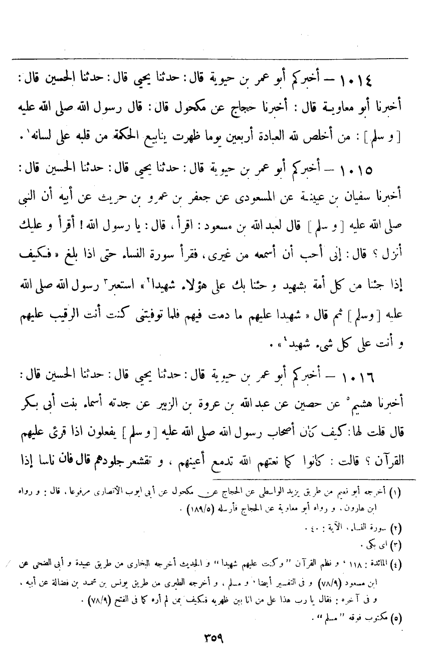 ١٠١٥ - أَخْبَرَكُمْ أَبُو عُمَرَ بْنُ حَيَوَيْهِ قَالَ: حَدَّثَنَا يَحْيَى قَالَ: حَدَّثَنَا الْحُسَيْنُ قَالَ: أَخْبَرَنَا سُفْيَانُ بْنُ عُيَيْنَةَ، عَنِ الْمَسْعُودِيِّ، عَنْ جَعْفَرِ بْنِ عَمْرِو بْنِ حُرَيْثٍ، عَنْ أَبِيهِ، أَنَّ النَّبِيَّ صَلَّى اللهُ عَلَيْهِ وَسَلَّمَ قَالَ لِعَبْدِ اللَّهِ بْنِ مَسْعُودٍ: «اقْرَأْ» ، قَالَ: يَا رَسُولَ اللَّهِ، أَقْرَأُ وَعَلَيْكَ أُنْزِلَ؟ قَالَ: «إِنِّي أُحِبُّ أَنْ أَسْمَعَهُ مِنْ غَيْرِي» ، فَقَرَأَ سُورَةَ النِّسَاءِ، حَتَّى إِذَا بَلَغَ {فَكَيْفَ إِذَا جِئْنَا مِنْ كُلِّ أُمَّةٍ بِشَهِيدٍ وَجِئْنَا بِكَ عَلَى هَؤُلَاءِ شَهِيدًا} [النساء: ٤١] اسْتَعْبَرَ رَسُولُ اللَّهِ صَلَّى اللهُ عَلَيْهِ وَسَلَّمَ، ثُمَّ قَالَ: «شَهِيدًا عَلَيْهِمْ مَا دُمْتُ فِيهِمْ فَلَمَّا تَوَفَّيْتَنِي كُنْتَ أَنْتَ الرَّقِيبَ عَلَيْهِمْ وَأَنْتَ عَلَى كُلِّ شَيْءٍ شَهِيدٌ»