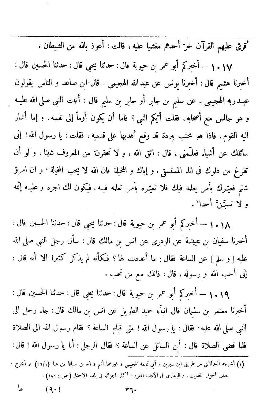 ١٠١٧ - أَخْبَرَكُمْ أَبُو عُمَرَ بْنُ حَيَوَيْهِ قَالَ: حَدَّثَنَا يَحْيَى قَالَ: حَدَّثَنَا الْحُسَيْنُ قَالَ: أَخْبَرَنَا هُشَيْمٌ قَالَ: أَخْبَرَنَا يُونُسُ، عَنْ عَبِيدَةَ الْهُجَيْمِيِّ - قَالَ ابْنُ صَاعِدٍ: " وَالنَّاسُ يَقُولُونَ: عَبْدُ رَبِّهِ الْهُجَيْمِيُّ " - عَنْ سُلَيْمِ بْنِ جَابِرٍ أَوْ جَابِرِ بْنِ سُلَيْمٍ قَالَ: أَتَيْتُ النَّبِيَّ صَلَّى اللهُ عَلَيْهِ وَسَلَّمَ وَهُوَ جَالِسٌ مَعَ أَصْحَابِهِ، فَقُلْتُ: أَيُّكُمُ النَّبِيُّ؟ فَإِمَّا أَنْ يَكُونَ أَوْمَأَ إِلَى نَفْسِهِ، وَإِمَّا أَشَارَ إِلَيْهِ الْقَوْمُ، فَإِذَا هُوَ مُحْتَبٍ بِبُرْدَةٍ قَدْ وَقَعَ هُدْبُهَا عَلَى قَدَمَيْهِ، فَقُلْتُ: يَا رَسُولَ اللَّهِ، إِنِّي سَائِلُكَ عَنْ أَشْيَاءَ، فَعَلِّمْنِي، قَالَ: «اتَّقِ اللَّهَ، وَلَا تَحْقِرَنَّ مِنَ الْمَعْرُوفِ شَيْئًا، وَلَوْ أَنْ تُفْرِغَ مِنْ دَلْوِكَ فِي إِنَاءِ الْمُسْتَسْقِي، وَإِيَّاكَ وَالْمَخِيلَةَ، فَإِنَّ اللَّهَ لَا يُحِبُّ الْمَخِيلَةَ، وَإِنِ امْرُؤٌ شَتَمَ فَعَيَّرَكَ بِأَمْرٍ يَعْلَمُهُ فِيكَ، فَلَا تُعَيِّرْهُ بِأَمْرٍ تَعْلَمُهُ فِيهِ، فَيَكُونَ لَكَ أَجْرُهُ، وَعَلَيْهِ إِثْمُهُ، وَلَا تَسُبَّنَّ أَحَدًا»