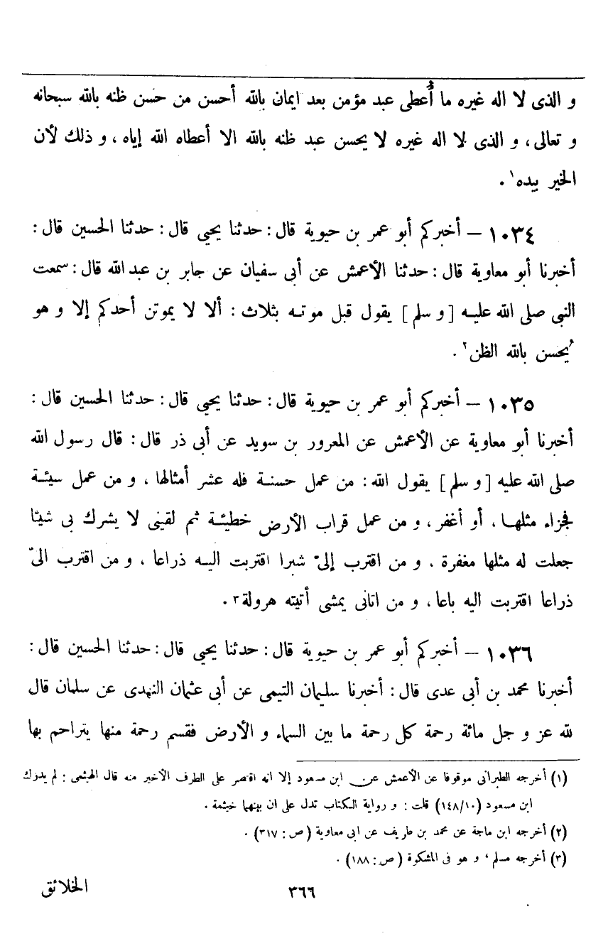 ١٠٣٤ - أَخْبَرَكُمْ أَبُو عُمَرَ بْنُ حَيَوَيْهِ قَالَ: حَدَّثَنَا يَحْيَى قَالَ: حَدَّثَنَا الْحُسَيْنُ، قَالَ: أَخْبَرَنَا أَبُو مُعَاوِيَةَ قَالَ: حَدَّثَنَا الْأَعْمَشُ، عَنْ أَبِي سُفْيَانَ، عَنْ جَابِرِ بْنِ عَبْدِ اللَّهِ قَالَ: سَمِعْتُ النَّبِيَّ صَلَّى اللهُ عَلَيْهِ وَسَلَّمَ يَقُولُ قَبْلَ مَوْتِهِ بِثَلَاثٍ: «أَلَا لَا يَمُوتَنَّ أَحَدُكُمْ إِلَّا وَهُوَ يُحْسِنُ بِاللَّهِ الظَّنَّ»