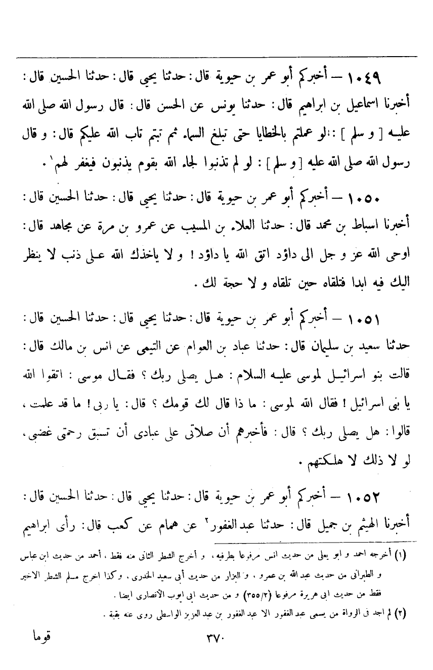 ١٠٤٩ - أَخْبَرَكُمْ أَبُو عُمَرَ بْنُ حَيَوَيْهِ قَالَ: حَدَّثَنَا يَحْيَى قَالَ: حَدَّثَنَا الْحُسَيْنُ، قَالَ: أَخْبَرَنَا إِسْمَاعِيلُ بْنُ إِبْرَاهِيمَ قَالَ: حَدَّثَنَا يُونُسُ، عَنِ الْحَسَنِ، قَالَ: قَالَ رَسُولُ اللَّهِ صَلَّى اللهُ عَلَيْهِ وَسَلَّمَ: «لَوْ عَمِلْتُمْ بِالْخَطَايَا حَتَّى تَبْلُغَ السَّمَاءَ، ثُمَّ تُبْتُمْ، تَابَ اللَّهُ عَلَيْكُمْ»