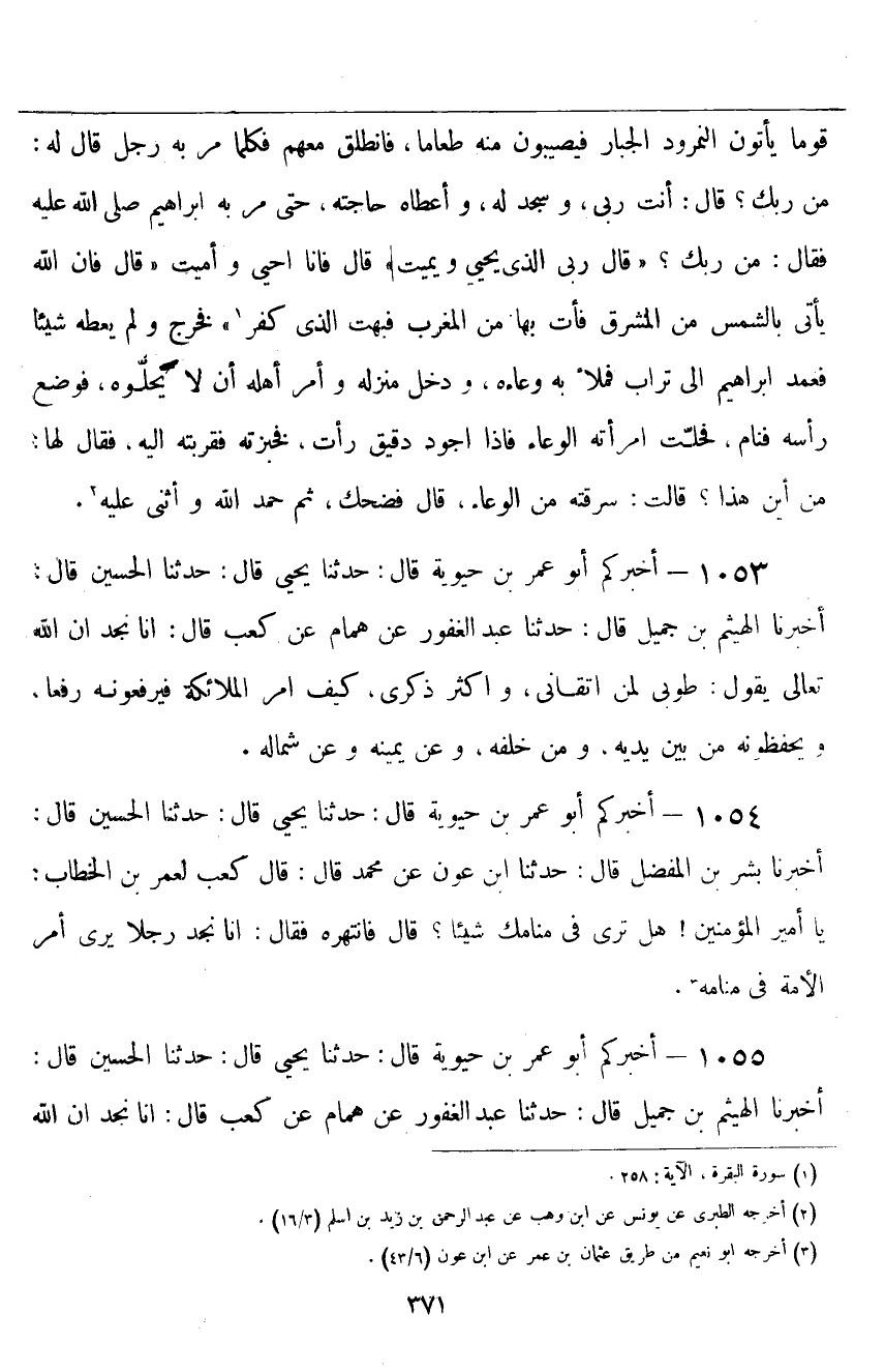 ١٠٥٣ - أَخْبَرَكُمْ أَبُو عُمَرَ بْنُ حَيَوَيْهِ قَالَ: حَدَّثَنَا يَحْيَى قَالَ: حَدَّثَنَا الْحُسَيْنُ، قَالَ: أَخْبَرَنَا الْهَيْثَمُ بْنُ جَمِيلٍ قَالَ: حَدَّثَنَا عَبْدُ الْغَفُورِ، عَنْ هَمَّامٍ، عَنْ كَعْبٍ قَالَ: " إِنَّا نَجِدُ أَنَّ اللَّهَ تَعَالَى يَقُولُ: طُوبَى لِمَنِ اتَّقَانِي وَأَكْثَرَ ذِكْرِي، كَيْفَ آمُرُ الْمَلَائِكَةَ فَيَرْفَعُونَهُ رَفْعًا، وَيَحْفَظُونَهُ مِنْ بَيْنِ يَدَيْهِ، وَمِنْ خَلْفِهِ، وَعَنْ يَمِينِهِ، وَعَنْ شِمَالِهِ؟
