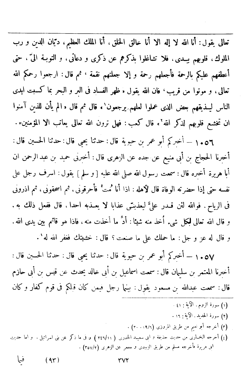 ١٠٥٦ - أَخْبَرَكُمْ أَبُو عُمَرَ بْنُ حَيَوَيْهِ قَالَ: حَدَّثَنَا يَحْيَى قَالَ: حَدَّثَنَا الْحُسَيْنُ، قَالَ: أَخْبَرَنَا الْحَجَّاجُ بْنُ أَبِي مَنِيعٍ، عَنْ جَدِّهِ، عَنِ الزُّهْرِيِّ قَالَ: أَخْبَرَنِي حُمَيْدُ بْنُ عَبْدِ الرَّحْمَنِ، أَنَّ أَبَا هُرَيْرَةَ، أَخْبَرَهُ قَالَ: سَمِعْتُ رَسُولَ اللَّهِ صَلَّى اللهُ عَلَيْهِ وَسَلَّمَ يَقُولُ: " أَسْرَفَ رَجُلٌ عَلَى نَفْسِهِ حَتَّى إِذَا حَضَرَتْهُ الْوَفَاةُ قَالَ لِأَهْلِهِ: إِذَا أَنَا مِتُّ فَأَحْرِقُونِي، ثُمَّ اسْحَقُونِي، ثُمَّ اذْرُونِي فِي الرِّيَاحِ، فَوَاللَّهِ لَئِنْ قَدَرَ عَلَيَّ لَيُعَذِّبَنِي عَذَابًا لَا يُعَذِّبُهُ أَحَدًا "، قَالَ: " فَفُعِلَ ذَلِكَ بِهِ، وَقَالَ اللَّهُ تَعَالَى لِكُلِّ شَيْءٍ أَخَذَ مِنْهُ شَيْئًا: أَدِّ مَا أَخَذْتَ مِنْهُ، فَإِذَا هُوَ قَائِمٌ بَيْنَ يَدَيِ اللَّهِ، وَقَالَ لَهُ عَزَّ وَجَلَّ: مَا حَمَلَكَ عَلَى مَا صَنَعْتَ؟ قَالَ: خَشِيتُكَ، فَغَفَرَ اللَّهُ لَهُ "