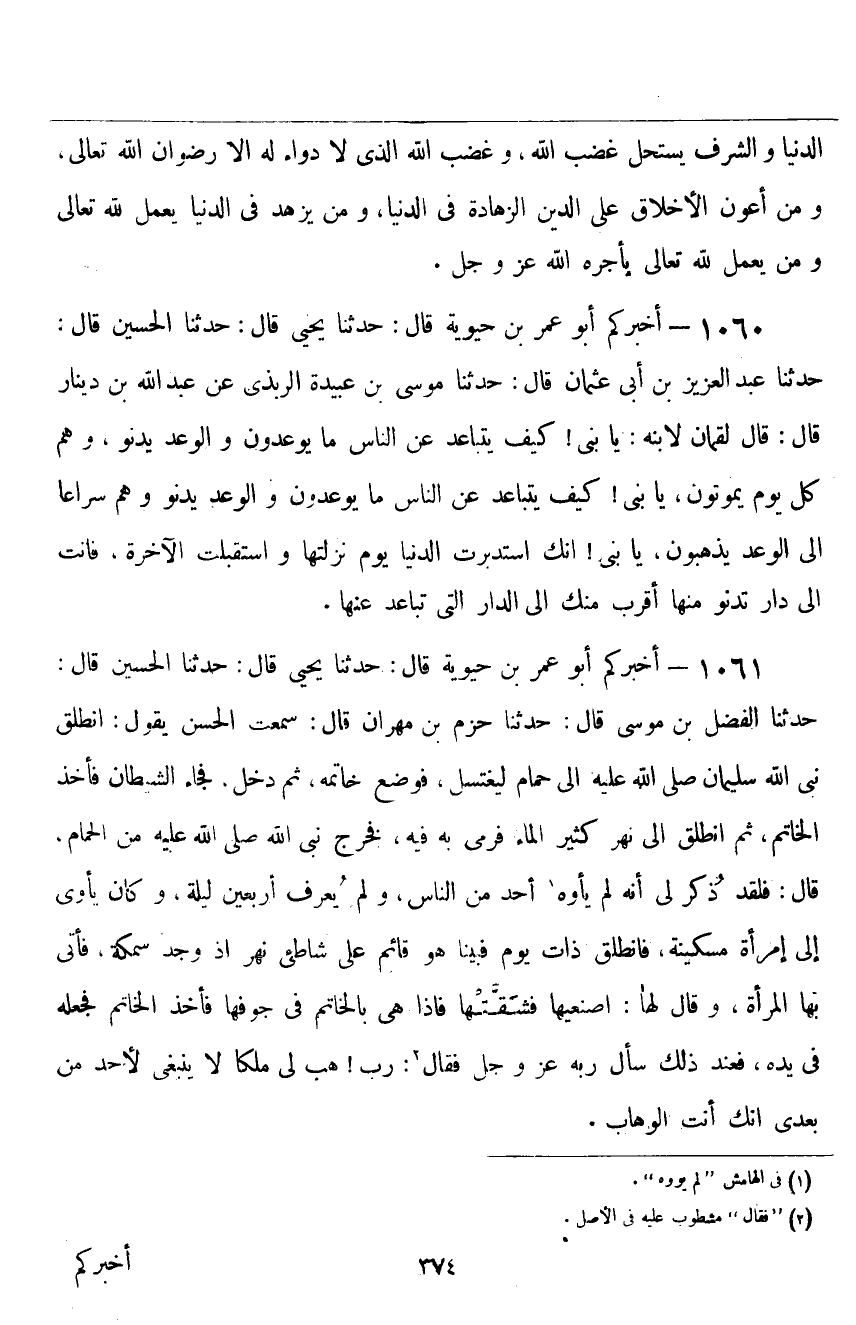١٠٦١ - أَخْبَرَكُمْ أَبُو عُمَرَ بْنُ حَيَوَيْهِ قَالَ: حَدَّثَنَا يَحْيَى قَالَ: حَدَّثَنَا الْحُسَيْنُ، قَالَ: حَدَّثَنَا الْفَضْلُ بْنُ مُوسَى قَالَ: حَدَّثَنَا حَزْمُ بْنُ مِهْرَانَ قَالَ: سَمِعْتُ الْحَسَنَ يَقُولُ: «انْطَلَقَ نَبِيُّ اللَّهِ سُلَيْمَانُ صَلَّى اللهُ عَلَيْهِ وَسَلَّمَ إِلَى الْحَمَّامِ لِيَغْتَسِلَ، فَوَضَعَ خَاتَمَهُ، ثُمَّ دَخَلَ، فَجَاءَ الشَّيْطَانُ فَأَخَذَ الْخَاتَمَ، ثُمَّ انْطَلَقَ إِلَى نَهْرٍ كَثِيرِ الْمَاءِ، فَرَمَى بِهِ فِيهِ، فَخَرَجَ نَبِيُّ اللَّهِ صَلَّى اللهُ عَلَيْهِ وَسَلَّمَ مِنَ الْحَمَّامِ» ، قَالَ: " فَلَقَدْ ذُكِرَ لِي أَنَّهُ لَمْ يَأْوِهِ أَحَدٌ مِنَ النَّاسِ، وَلَمْ يُعْرَفْ أَرْبَعِينَ لَيْلَةً، وَكَانَ يَأْوِي إِلَى امْرَأَةٍ مِسْكِينَةٍ، فَانْطَلَقَ ذَاتَ يَوْمٍ فَبَيْنَا هُوَ قَائِمٌ عَلَى شَاطِئِ نَهْرٍ، إِذْ وَجَدَ سَمَكَةً، فَأَتَى بِهَا الْمَرْأَةَ، وَقَالَ لَهَا: اصْنَعِيهَا، فَشَقَّتْهَا، فَإِذَا هِيَ بِالْخَاتَمِ فِي جَوْفِهَا، فَأَخَذَ الْخَاتَمَ فَجَعَلَهُ فِي يَدِهِ، فَعِنْدَ ذَلِكَ سَأَلَ رَبَّهُ عَزَّ وَجَلَّ، فَقَالَ: رَبِّ، هَبْ لِي مُلْكًا لَا يَنْبَغِي لِأَحَدٍ مِنْ بَعْدِي، إِنَّكَ أَنْتَ الْوَهَّابُ "