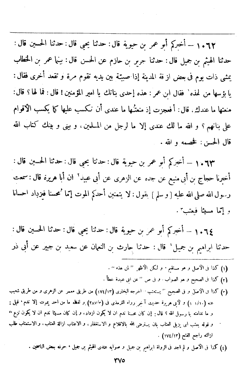 ١٠٦٢ - أَخْبَرَكُمْ أَبُو عُمَرَ بْنُ حَيَوَيْهِ قَالَ: حَدَّثَنَا يَحْيَى قَالَ: حَدَّثَنَا الْحُسَيْنُ، قَالَ: حَدَّثَنَا الْهَيْثَمُ بْنُ جَمِيلٍ قَالَ: حَدَّثَنَا جَرِيرُ بْنُ حَازِمٍ، عَنِ الْحَسَنِ قَالَ: بَيْنَمَا عُمَرُ بْنُ الْخَطَّابِ يَمْشِي ذَاتَ يَوْمٍ فِي بَعْضِ أَزِقَّةِ الْمَدِينَةِ، إِذَا صَبِيَّةٌ بَيْنَ يَدَيْهِ تَقُومُ مَرَّةً، وَتَقْعُدُ أُخْرَى، فَقَالَ: «يَا بُؤْسَهَا، مَنْ لِهَذِهِ؟» فَقَالَ ابْنُ عُمَرَ: هَذِهِ إِحْدَى بَنَاتِكَ يَا أَمِيرَ الْمُؤْمِنِينَ، قَالَ: «فَمَا لَهَا؟» قَالَ: مَنَعْتَهَا مَا عِنْدَكَ، قَالَ: «أَفَعَجِزْتَ إِذْ مَنَعْتُهَا مَا عِنْدِي أَنْ تَكْسِبَ عَلَيْهَا كَمَا يَكْسِبُ الْأَقْوَامُ عَلَى بَنَاتِهِمْ؟ وَاللَّهِ مَا لَكَ عِنْدِي إِلَّا مَا لِرَجُلٍ مِنَ الْمُسْلِمِينَ، وَبَيْنِي وَبَيْنَكَ كِتَابُ اللَّهِ» ، قَالَ الْحَسَنُ: «فَخَصَمَهُ وَاللَّهِ»