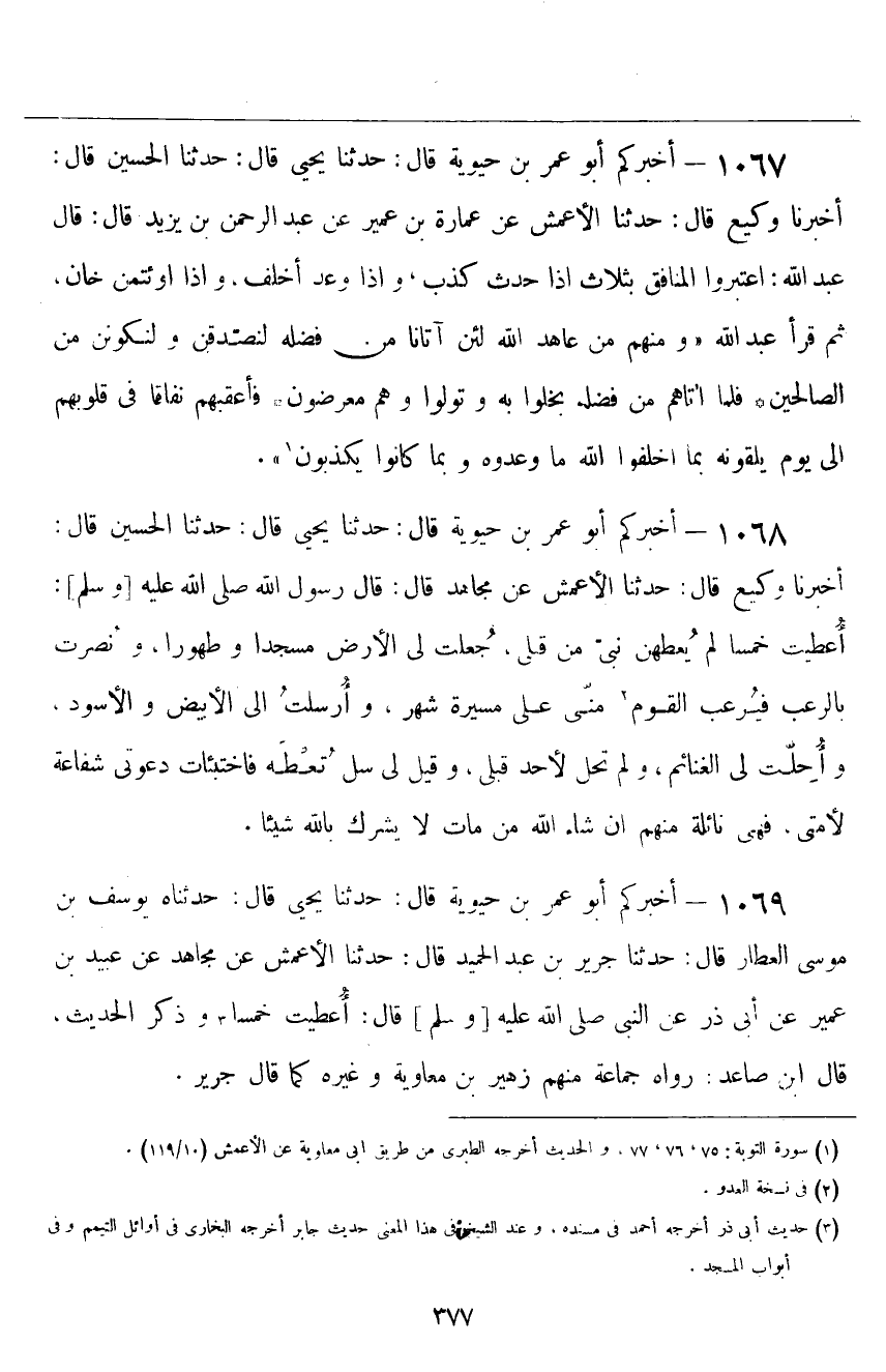 ١٠٦٧ - أَخْبَرَكُمْ أَبُو عُمَرَ بْنُ حَيَوَيْهِ قَالَ: حَدَّثَنَا يَحْيَى قَالَ: حَدَّثَنَا الْحُسَيْنُ، قَالَ: أَخْبَرَنَا وَكِيعٌ قَالَ: حَدَّثَنَا الْأَعْمَشُ، عَنْ عُمَارَةَ بْنِ عُمَيْرٍ، عَنْ عَبْدِ الرَّحْمَنِ بْنِ يَزِيدَ قَالَ: قَالَ عَبْدُ اللَّهِ: " اعْتَبِرُوا الْمُنَافِقَ بِثَلَاثٍ: إِذَا حَدَّثَ كَذَبَ، وَإِذَا وَعَدَ أَخْلَفَ، وَإِذَا ائْتُمِنَ خَانَ، ثُمَّ قَرَأَ عَبْدُ اللَّهِ: {وَمِنْهُمْ مَنْ عَاهَدَ اللَّهَ لَئِنْ آتَانَا مِنْ فَضْلِهِ لَنَصَدَّقَنَّ وَلَنَكُونَنَّ مِنَ الصَّالِحِينَ فَلَمَّا أَتَاهُمْ مِنْ فَضْلِهِ بَخِلُوا بِهِ وَتَوَلَّوْا وَهُمْ مُعْرِضُونَ فَأَعْقَبَهُمْ نِفَاقًا فِي قُلُوبِهِمْ إِلَى يَوْمِ يَلْقَوْنَهُ بِمَا أَخْلَفُوا اللَّهَ مَا وَعَدُوهُ وَبِمَا كَانُوا يَكْذِبُونَ} "
